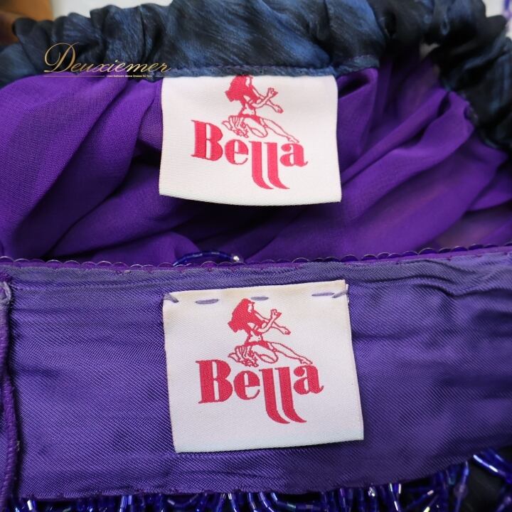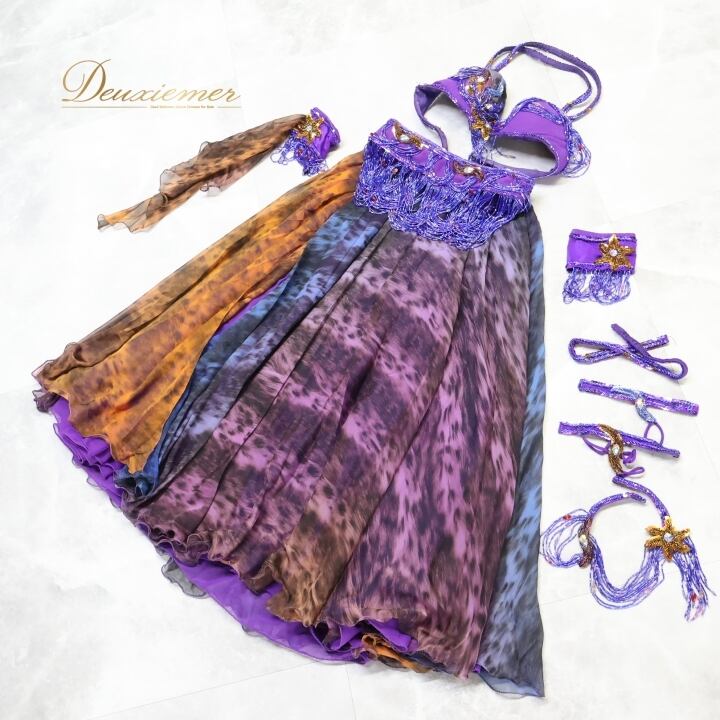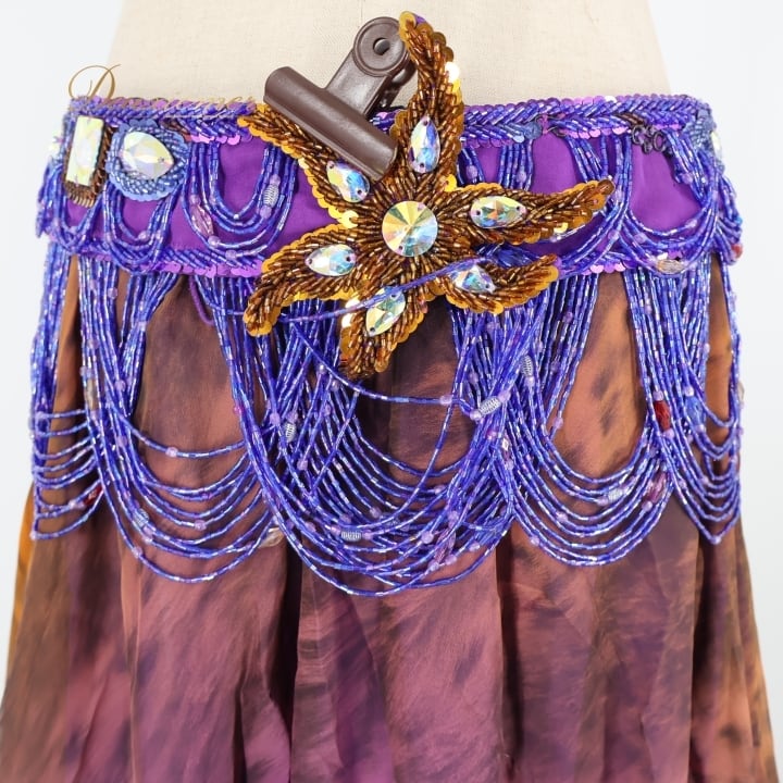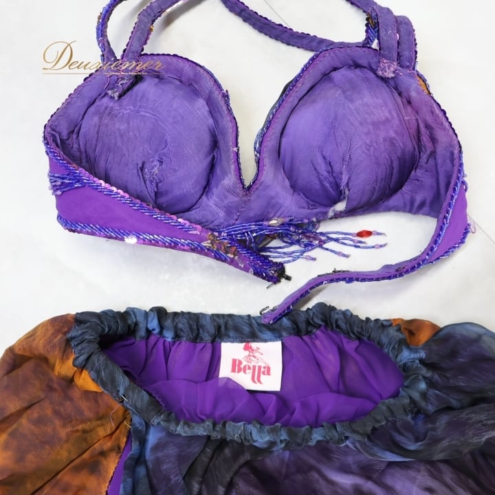 ベリーダンス オリエンタル 衣装 上下セット パープル系 ベラ Bella ラインストーン スパンコール トップス スカート ベルト アーム飾り 腕飾り 煌びやか 華やか 紫 金 セットアップ キラキラ ビーズ セクシー ダンス衣装 豪華 装飾 ゴールド系