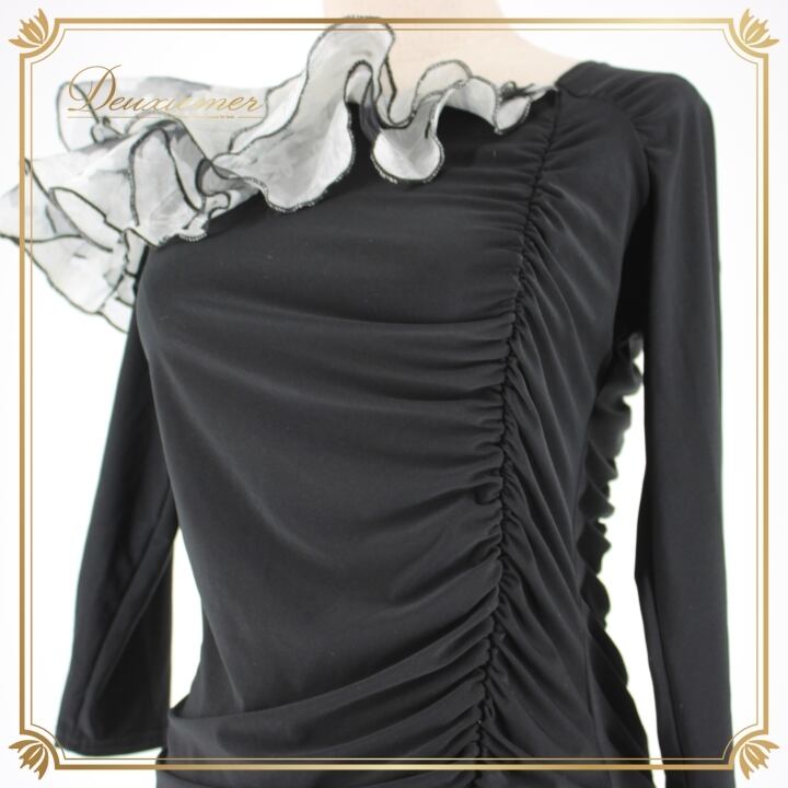 社交ダンス 衣装 スタンダード トップス レッスンウェア 黒 Leirena レイリーナ グレイ系 ブラック系 ホワイト系 白 花柄 フリル アシメ シック アシンメトリー ストレッチ素材 フェミニン 伸縮性 ダンス衣装 おしゃれ スタイリッシュ プリント トップスコーデ ルームウェア スポーツウェア お出かけ 用途多様 体型カバー 洗練されたデザイン