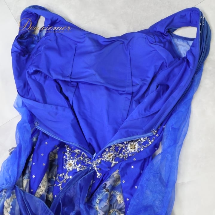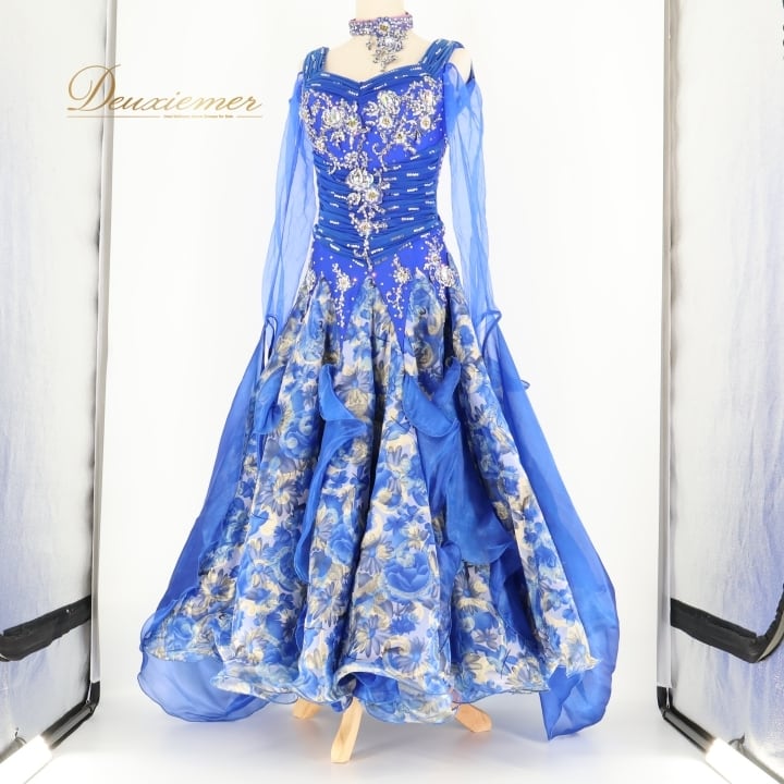 社交ダンス 衣装 スタンダード ドレス ワンピース スタンダードドレス デモ 競技 花柄 フロート レース パーティ 発表会 青 ブルー系 おしゃれ デザイン 上品 きれい スカート 重ね着 競技用 フレアドレス 大人用 発表会衣装 ダンス発表会 フラワープリント 衣装セット レディース ダンスウェア