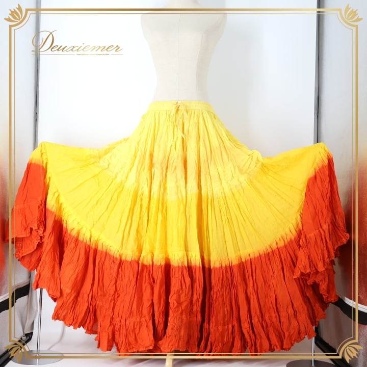 #ベリーダンス #ダンス衣装 #ジプシースカート #コットン100 #グラデーション #イエローオレンジ #鮮やかな色合い #シンプルデザイン #ボリューム満点 #ウエストゴム #ダンススタイル #衣装コーデ #フラメンコ #スカートファッション #トルソー展示 #ダンスパフォーマンス #衣裳選び #ダンス好き #コスチューム #パーティー衣装 #ENUTSU