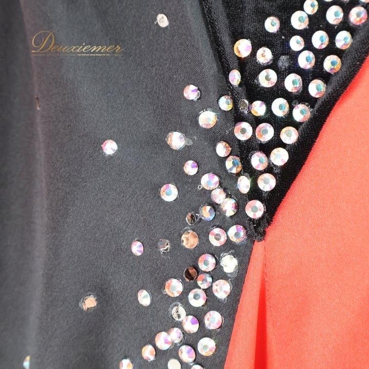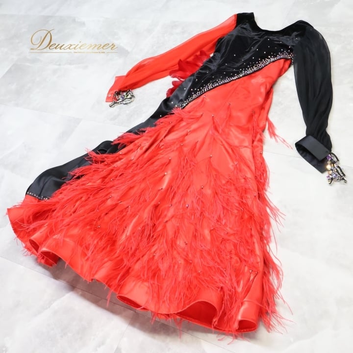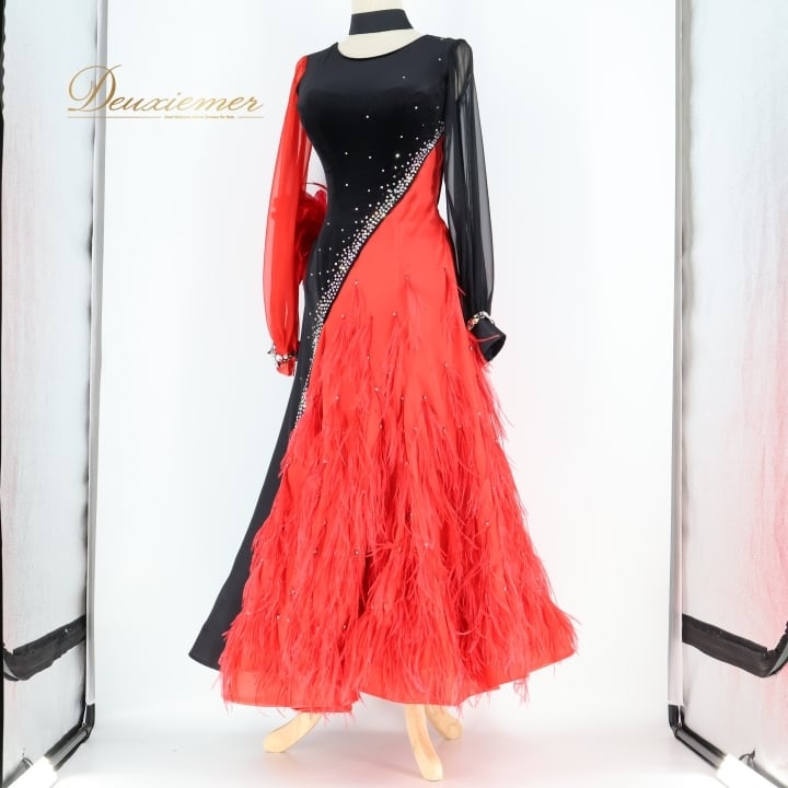 社交ダンス 衣装 スタンダードドレス ドレス ワンピース スタンダード 赤 黒 羽 ファー デモ 競技 ダンス パーティ 発表会 豪華 華やか ブラック系 レッド系 ベロア 大きな花モチーフ 高級感 おしゃれ ゴージャス ダンス衣装 イベント用 フォーマル レディース フェザー 飾り