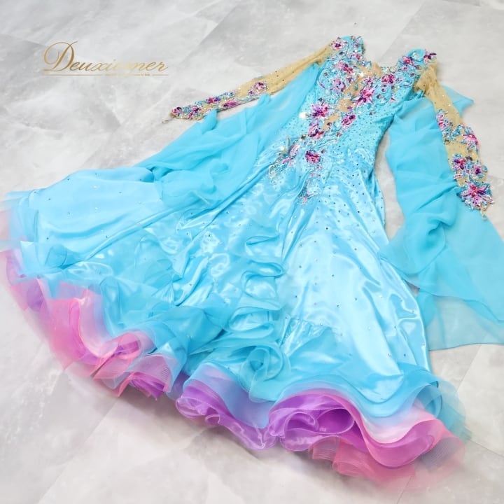 社交ダンス 衣装 スタンダードドレス ドレス ワンピース スタンダード 水色 ピンク フロート フリル レース デモ 競技 ダンス パーティ 発表会 ブルー系 ピンク系 光沢 明るい 鮮やか おしゃれ 伸縮性 競技用発表会用 コスチューム フォーマルパーティ