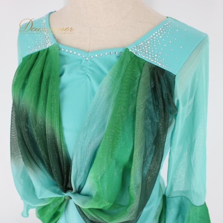 #社交ダンス #ダンス衣装 #セットアップ #ライトブルー #グリーン #ラインストーン #スカート #ポリエステル #ポリウレタン #伸縮性 #ウエストゴム #女性用 #ダンスファッション #トルソー #ダンススタジオ #ダンスパフォーマンス #ダンス衣装セット #おしゃれ #ダンスウェア #ENUTSU