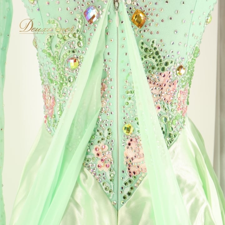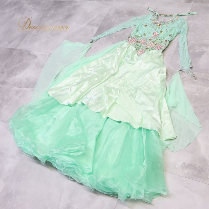 社交ダンス 衣装 スタンダードドレス ワンピース ドレス 緑 ミント 水色 黄緑 フロート デモ 競技 ダンス パーティ 発表会 日本製 グリーン系 パステルカラー 軽やか 印象 美しい コスチューム 競技用 フォーマル モダンダンス ブルー系 フリル デザイン ダンスイベント 発表会用 おしゃれ ステージ衣装