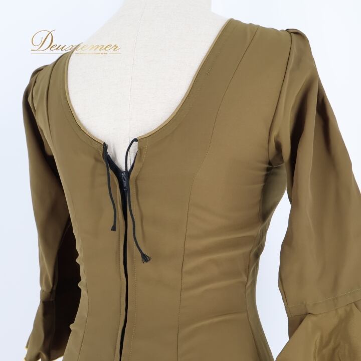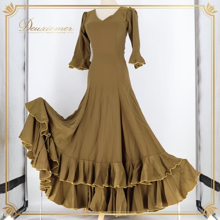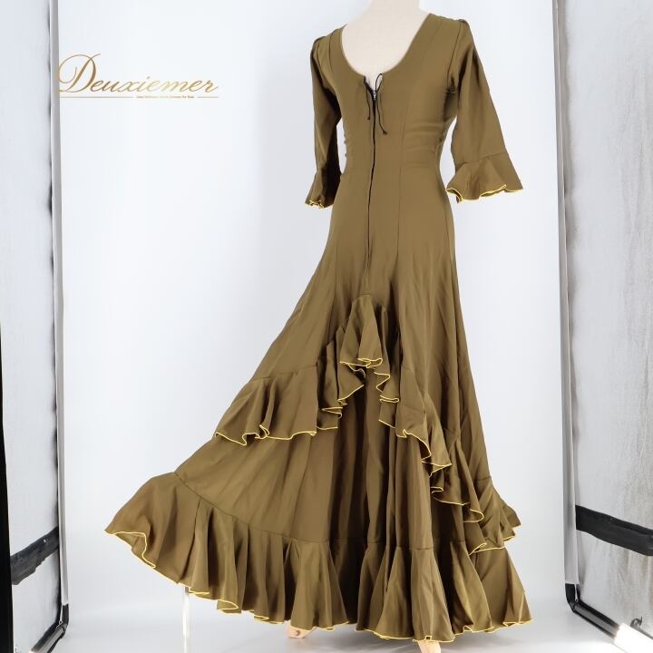 #フラメンコ #衣装 #ドレス #ワンピース #くすみカーキ #おしゃれ #シージョ #華やか #ファッション #パーティードレス #ダンス衣装 #女性用 #トルソー #ステージ衣装 #アート #コスチューム #フラメンコ衣装 #モダン #クラシック #ENUTSU