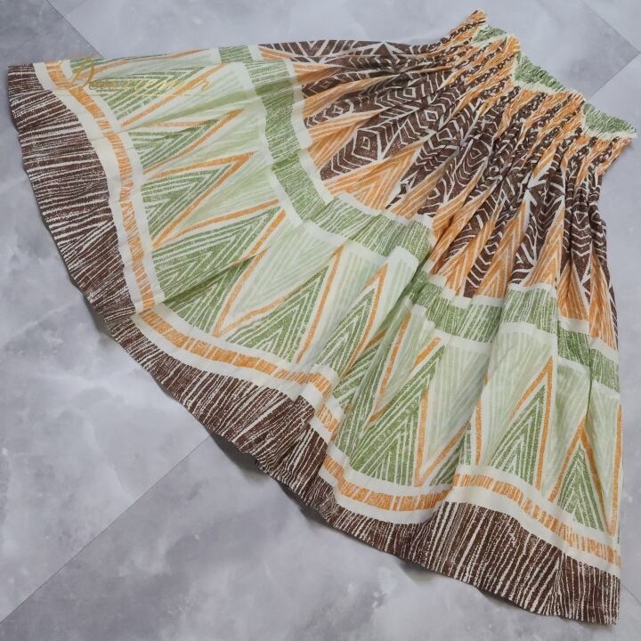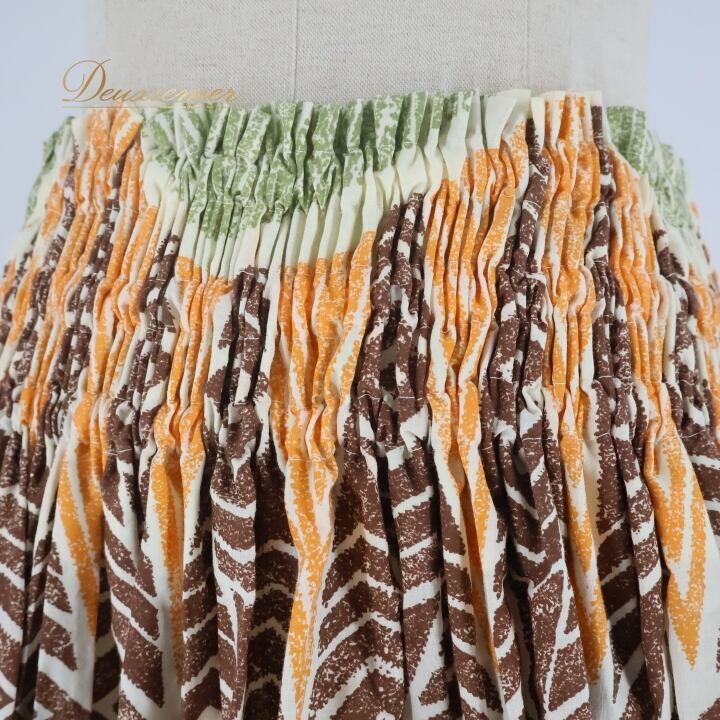 フラダンス 衣装 パウスカート グリーン系 ブラウン系 シングル シンプル カヒコ柄 かわいい 鮮やか 華やか 明るい ふわふわ カラフル ハワイアン アロハ ハワイアンプリント フラ ダンス レッスン 練習 オレンジ系 軽やか カラフルデザイン 柄物