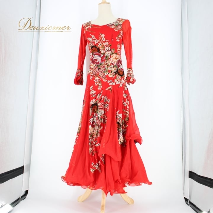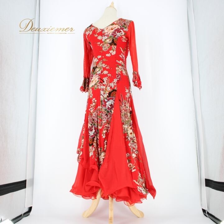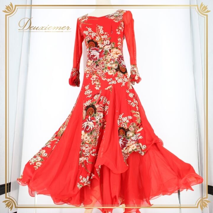#社交ダンス #ダンス衣装 #ドレス #花柄 #赤 #ダンスコスチューム #ファッション #女性用トルソー #ポリエステル #ポリウレタン #おしゃれ #ダンススタイル #スタイリッシュ #ダンスパフォーマンス #ダンスファッション #パーティードレス #イベント #ダンスウェア #エレガント #ダンスレッスン #ドレスアップ #ENUTSU