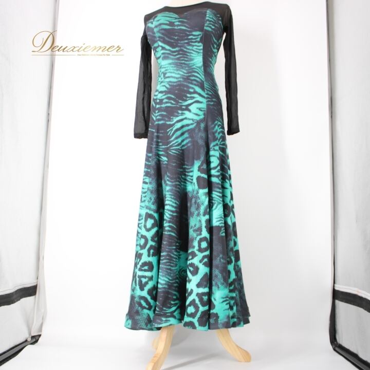 社交ダンス 衣装 スタンダード ドレス ワンピース パーティ衣装 オールシーズン グリーン系 青緑 黒 ブラック系 レース バイカラー 長袖 派手 ダンス衣装 フルスカート 袖あり おしゃれ 着やすい 伸縮性 120cm丈 フィット感 レディース パーティー 競技会 スタイル 艶やか エレガント 鮮やか 柄物