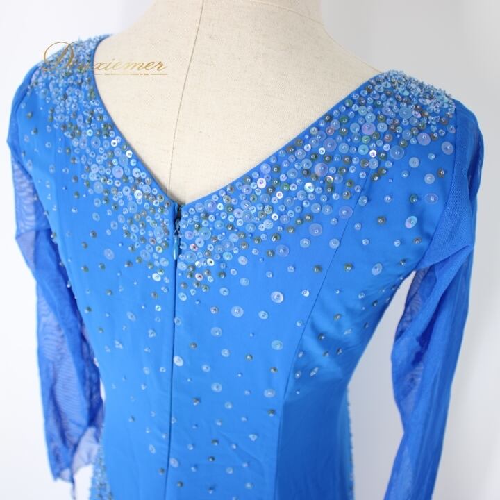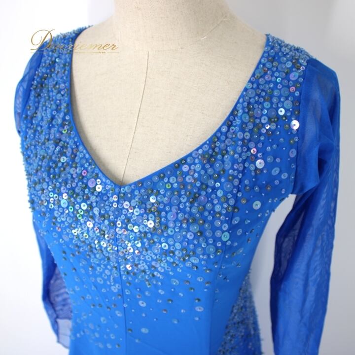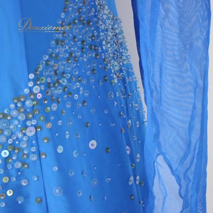 社交ダンス 衣装 スタンダード ドレス ワンピース パーティ衣装 オールシーズン DANCE FASHION EVE ダンスファッションイヴ 青 ブルー系 ビジュー 長袖 ロングドレス フィット感 パーティー用 エレガント おしゃれ ダンス用 衣装 レディース ステージ衣装 社交ダンス用 競技用 発表会 着こなし 着心地 丈夫 お手入れ簡単 コスチューム