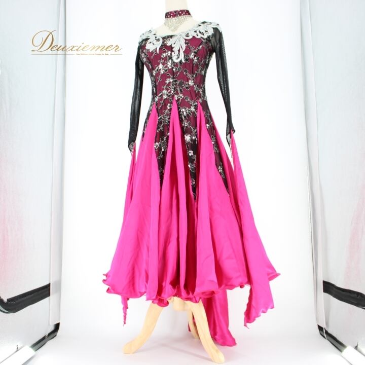 #社交ダンス #ダンス衣装 #ドレス #マゼンダピンク #ブラック #ファスナー付き #伸縮性 #スカート #フロートデザイン #スパンコール #ラインストーン #女性用トルソー #ダンスファッション #レイリーナ #Mサイズ #舞う #衣装 #特別な日 #パーティー #ENUTSU