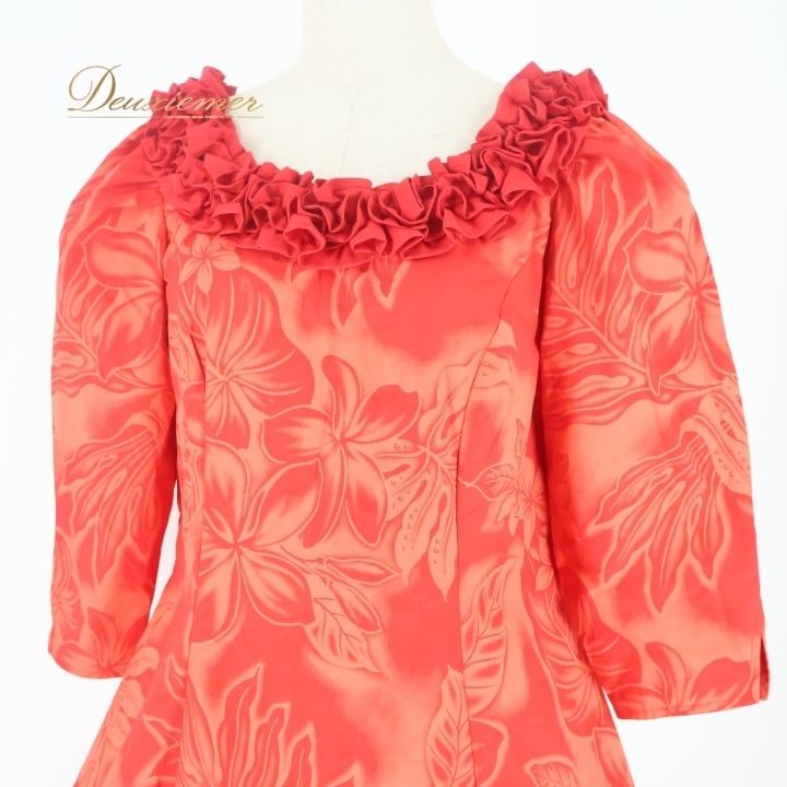 フラダンス 衣装 ワンピース ドレス レッド系 CC Fashions ハワイ製 プルメリア柄 モンステラ柄 ハワイアンプリント アロハ フラ ダンス レッスン 練習 フリル 五分袖 ワンカラー かわいい おしゃれ 上品 華やか 鮮やか ハワイ 服飾 レディース かわいいドレス エレガント