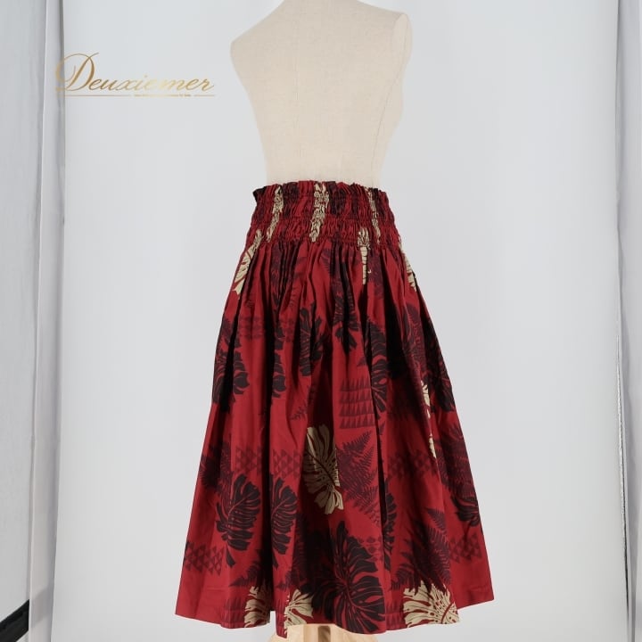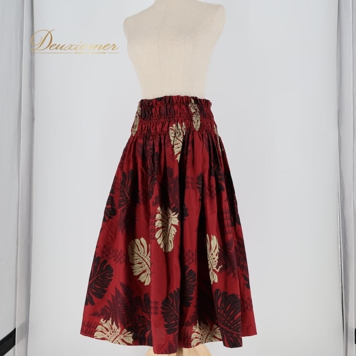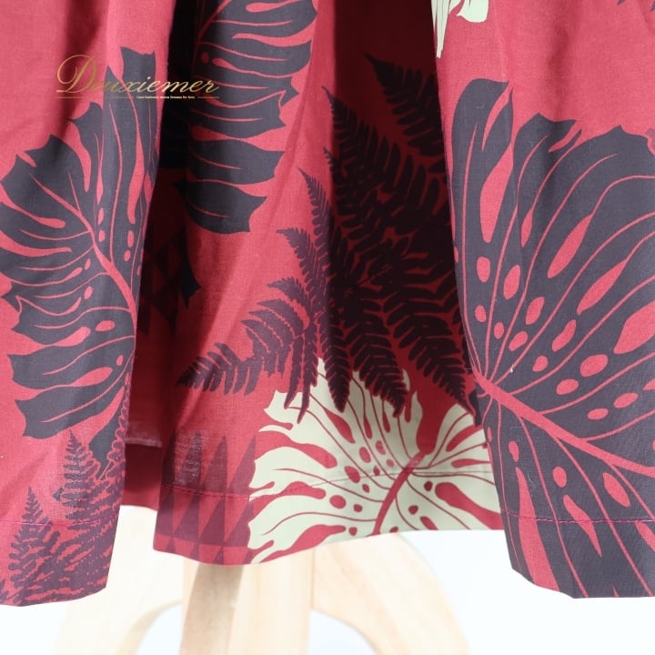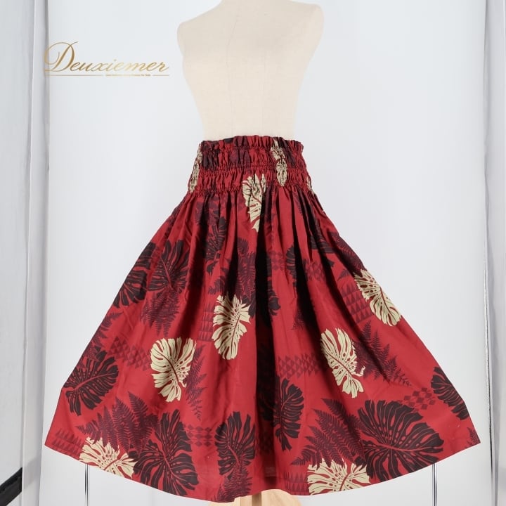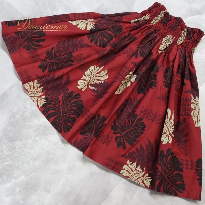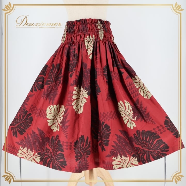フラダンス 衣装 パウスカート レッド系 シングル モンステラ柄 パラパライ柄 かわいい 華やか 鮮やか 明るい ふわふわ ハワイアン アロハ ハワイアンプリント フラ ダンス レッスン 練習 ハワイアンスタイル 南国風 ダンスレッスン用