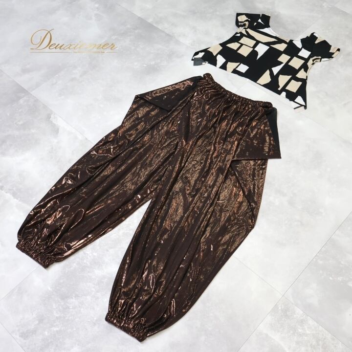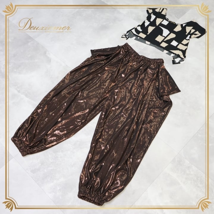 ベリーダンス 衣装 上下セット ブラウン系 miyamiya レッスン 練習 トップス ズボン パンツ ボトムス 茶 黒 白 光沢 ハーレムパンツ ツーピース セットアップ 伸縮 ストレッチ ブラック系 ホワイト系 ベージュ系