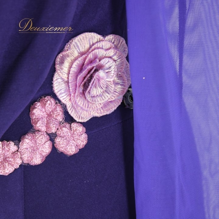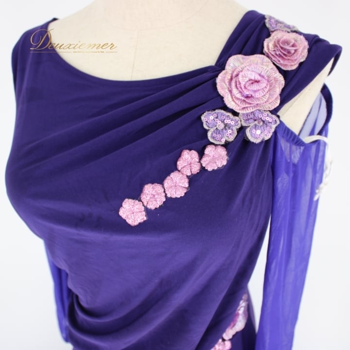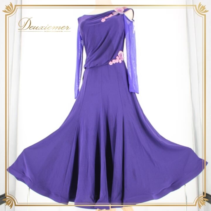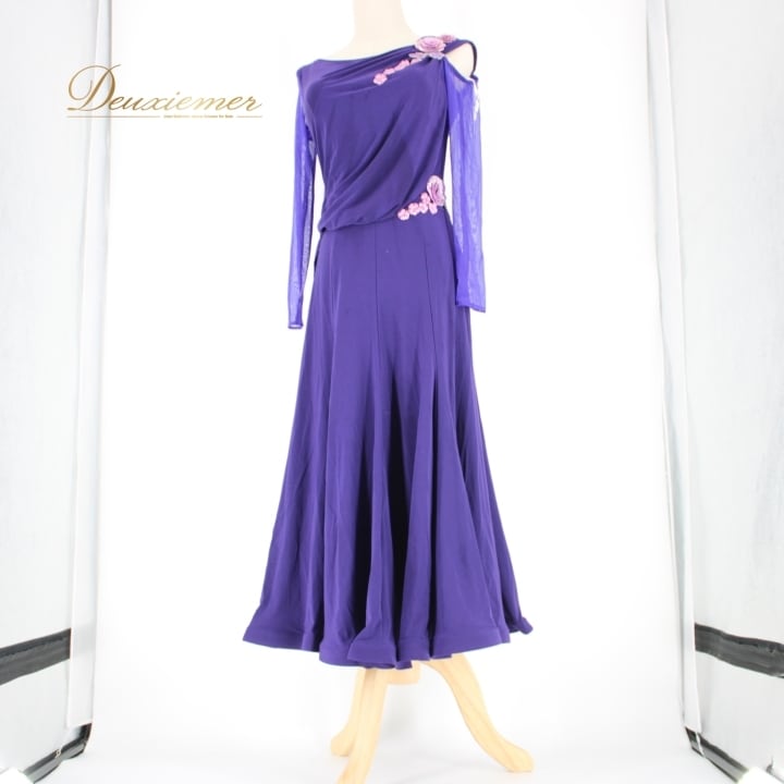 #社交ダンス #ダンス衣装 #バイオレット #ドレス #女性用衣装 #ピンク花飾り #パーティードレス #ダンスパフォーマンス #ファッション #ダンス #オシャレ #コスチューム #ダンスショップ #ニット #特別な日 #大人の魅力 #フォーマル #スタイル #衣装レンタル #ENUTSU