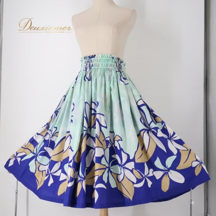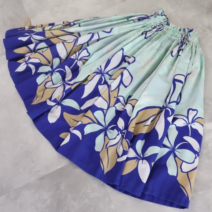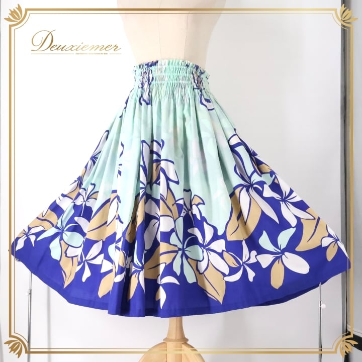 フラダンス 衣装 パウスカート ブルー系 ココエミリー 日本製 ハワイアンプリント プルメリア CoCoEmily アロハ レッスン 練習 フラ ダンス かわいい おしゃれ さわやか 上品 シングル スカート ホワイト系 ベージュ系
