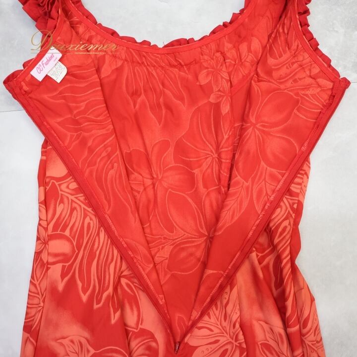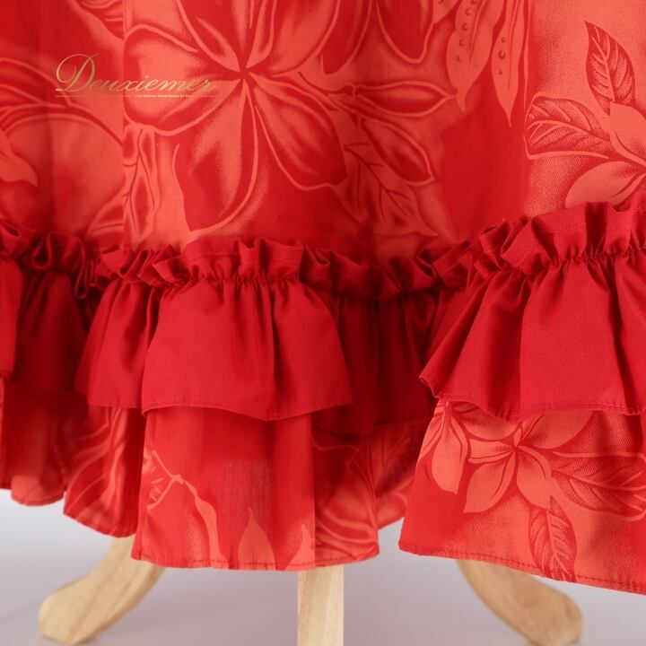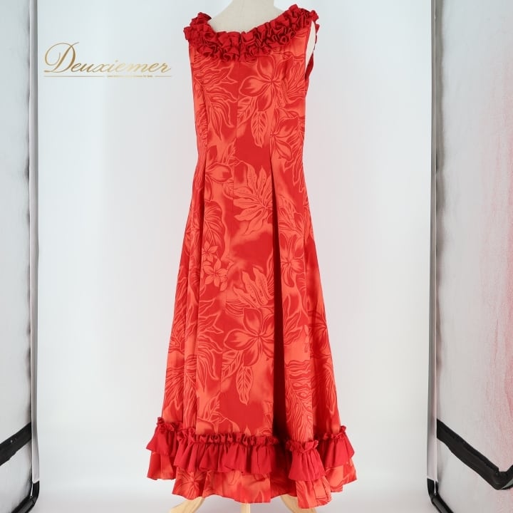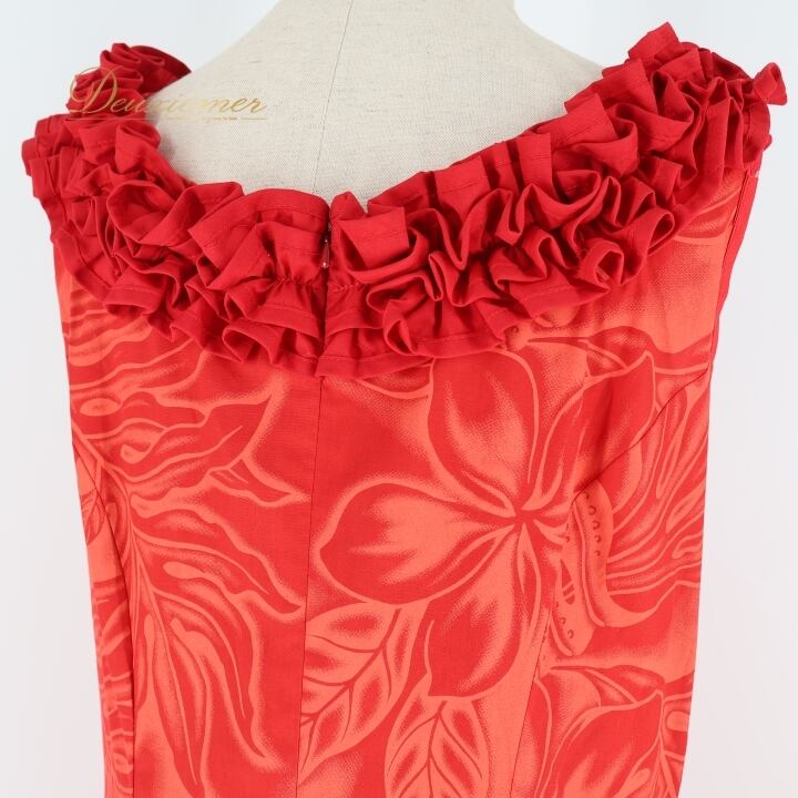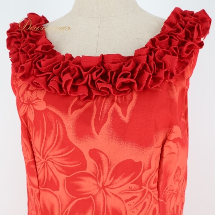 フラダンス 衣装 ワンピース ドレス CC Fashions レッド系 ハワイ製 ノースリーブ フリル ワントーン モンステラ柄 プルメリア柄 かわいい 華やか 鮮やか 明るい ハワイアン アロハ ハワイアンプリント フラ ダンス レッスン 練習 上品
