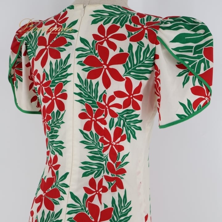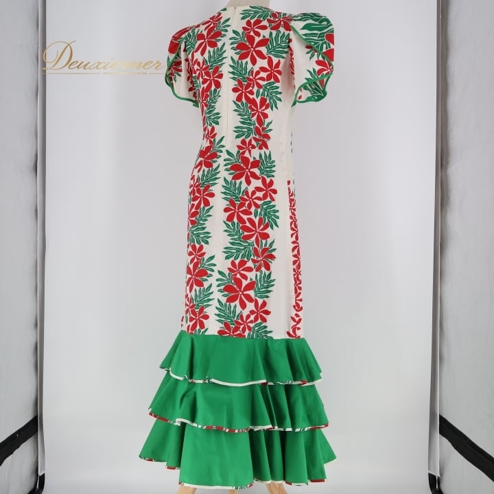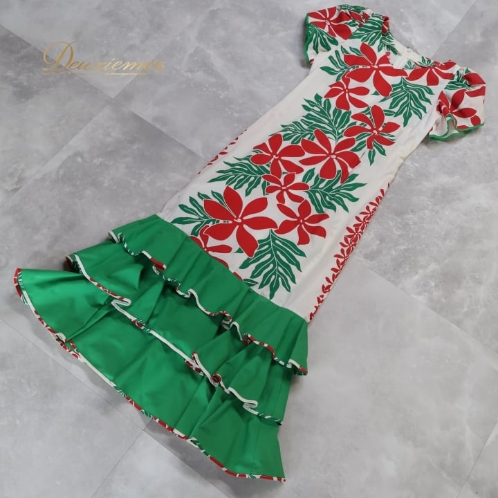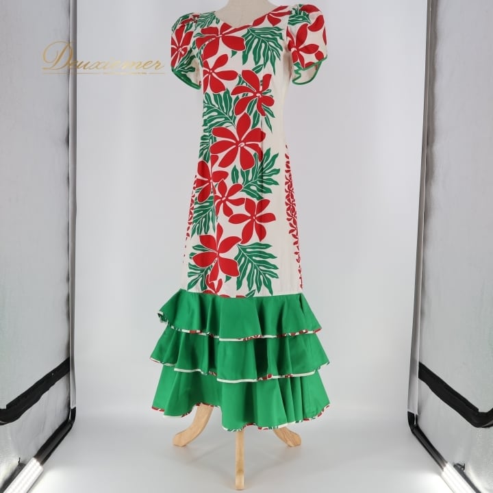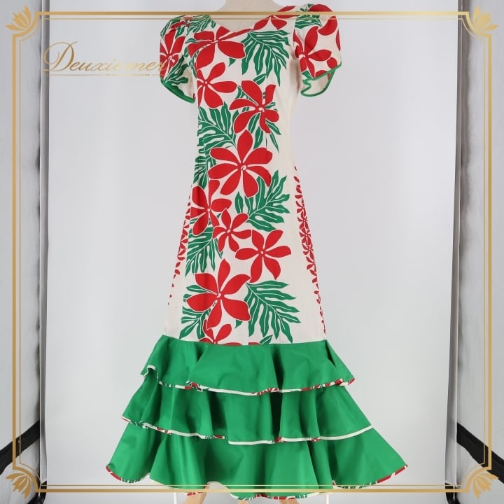 フラダンス 衣装 ワンピース ドレス グリーン系 パフスリーブ フリル ティアレ柄 ラウアエ柄 かわいい 鮮やか 華やか 明るい レッド系 ハワイアン アロハ ハワイアンプリント フラ ダンス 練習 レッスン ホワイト系 レディース