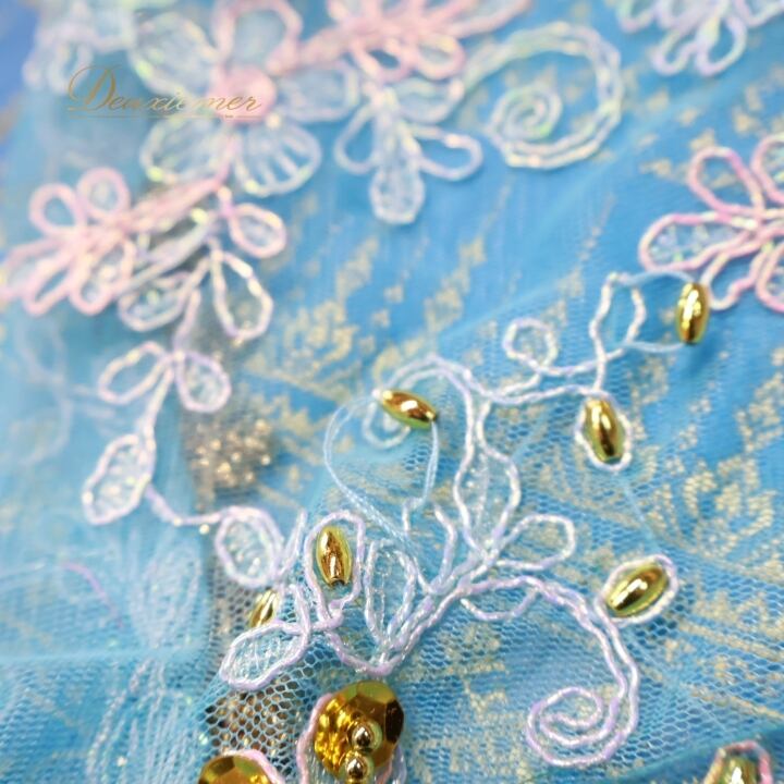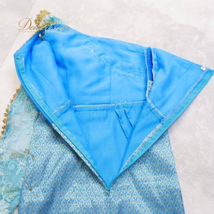 水色ワンピースの装飾にゆるみ有り。手縫いで付けられております。