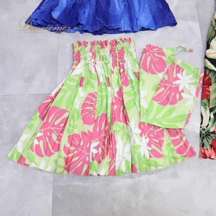 フラダンス 衣装 子供用 まとめ売り 全6点 セット ジュニア キッズ ケイキ 黄緑 青 緑 白 黒 パウスカート ワンピース ドレス モンステラ柄 ハイビスカス柄 花柄 スカート 装飾 レッスン 練習 ピンク系 ブルー系 グリーン系 ブラック系 ホワイト系
