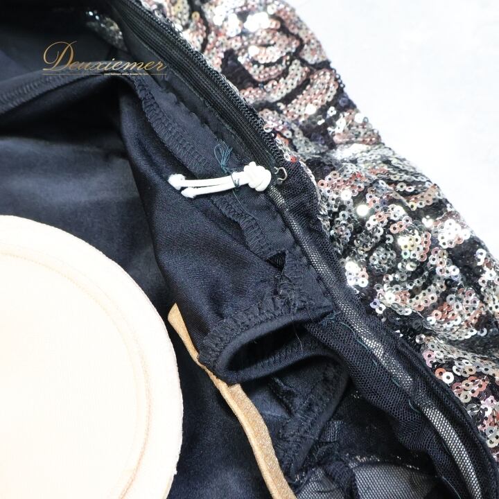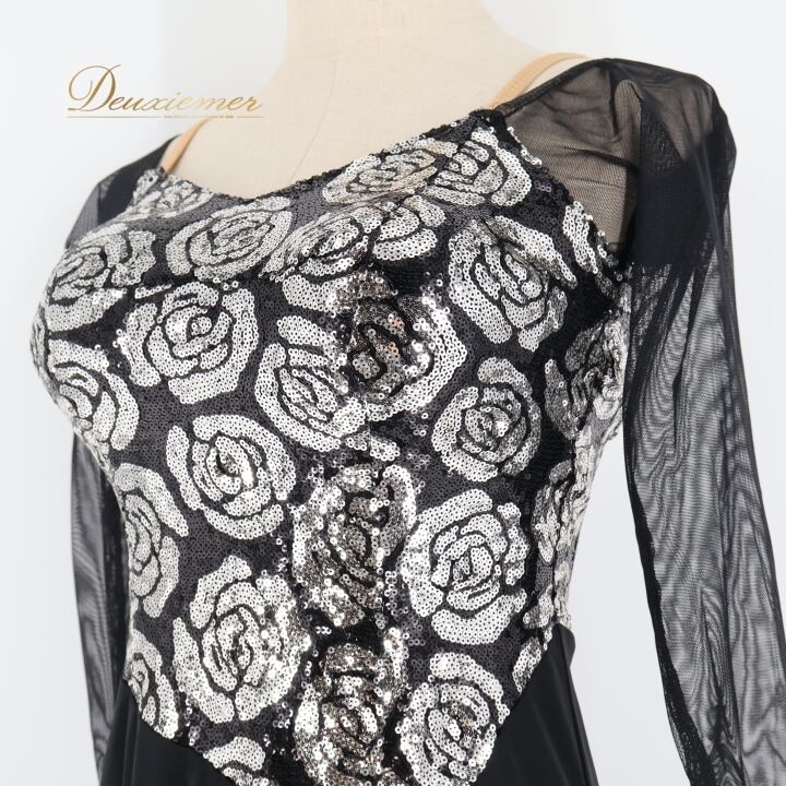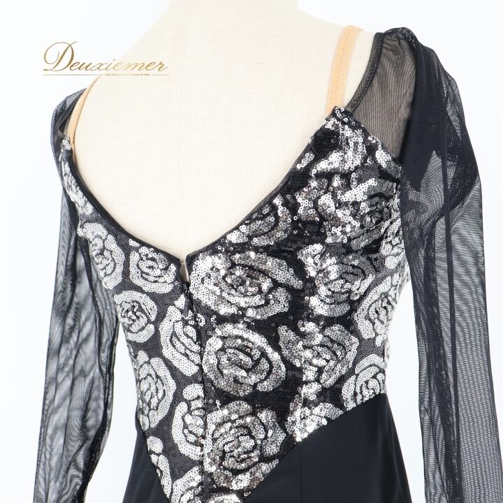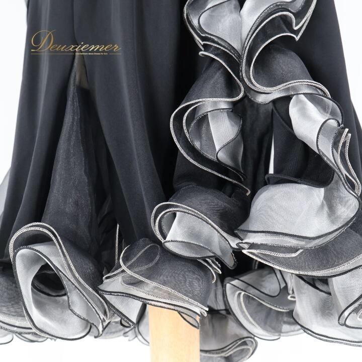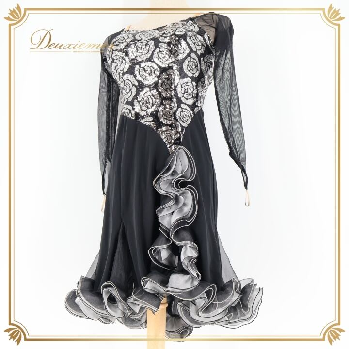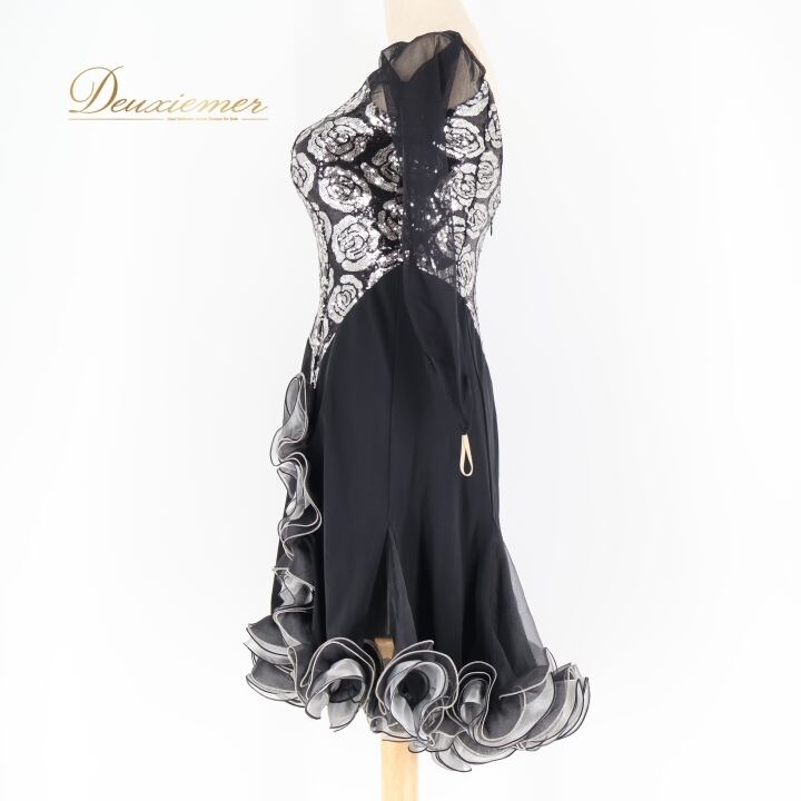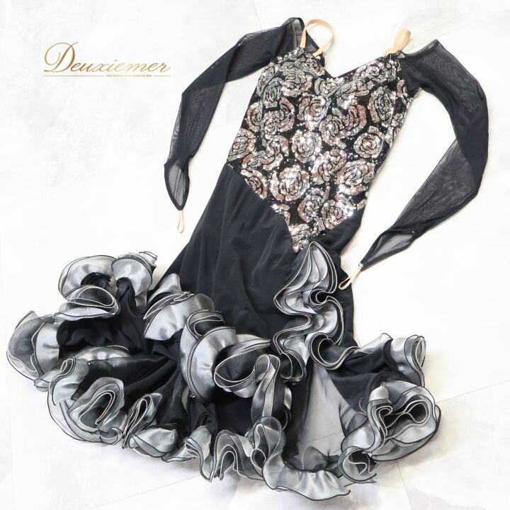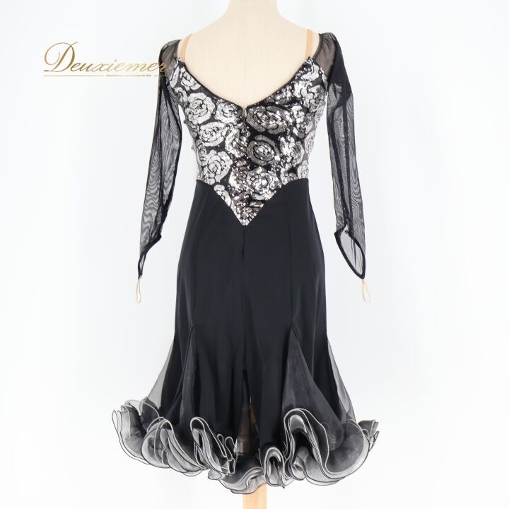 #社交ダンス #ダンス衣装 #ラテンドレス #ワンピース #7号 #日本製 #SEKINE #ブラック #シルバー #フリル #女性用 #ダンスパフォーマンス #ドレス #レオタード #ファスナー #ストレッチ #胸パッド #トルソー #ダンスファッション #ENUTSU
