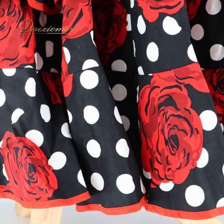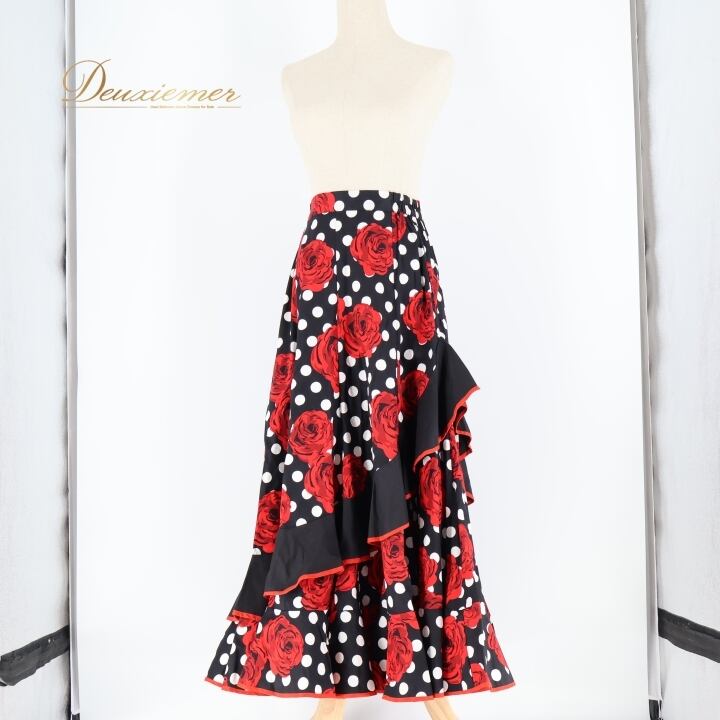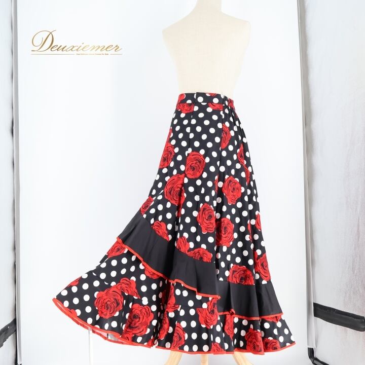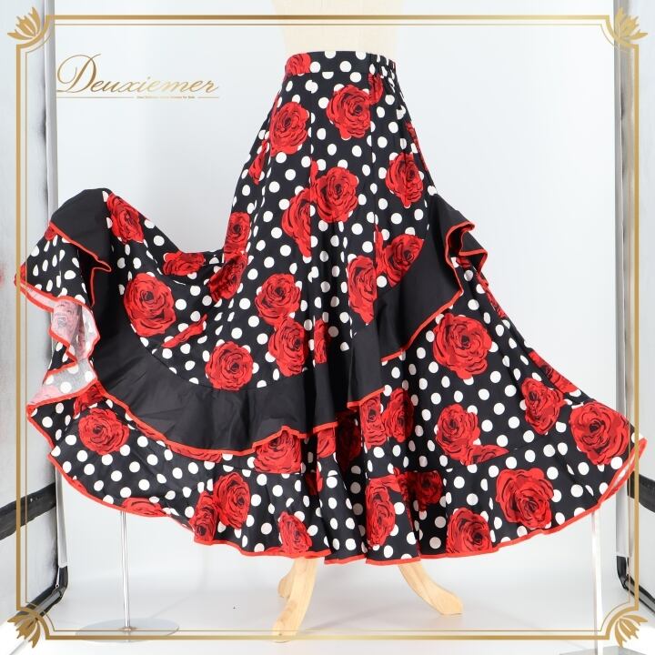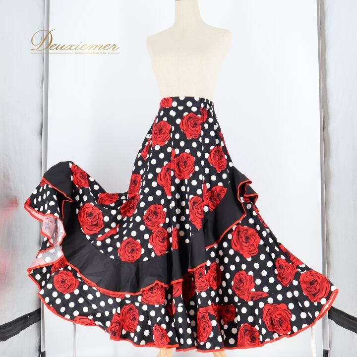 フラメンコ 衣装 ファルダ スカート 花柄 薔薇 水玉 ボランテ フリル 黒 赤 ドット ダンス パーティ 華やか ブラック系 レッド系 おしゃれ 女性用 パーティー用 デザイン