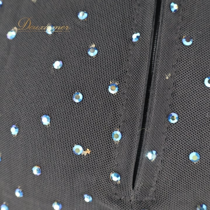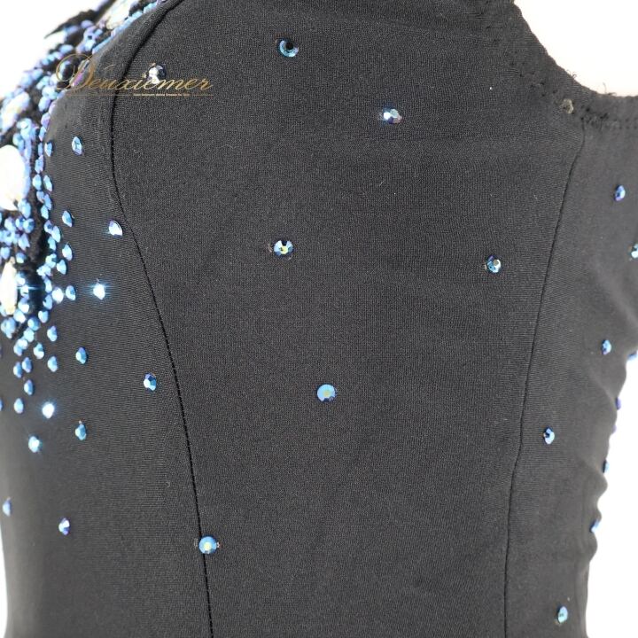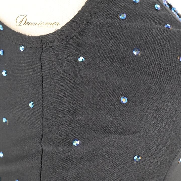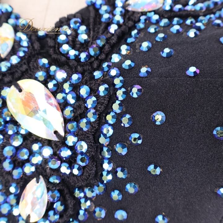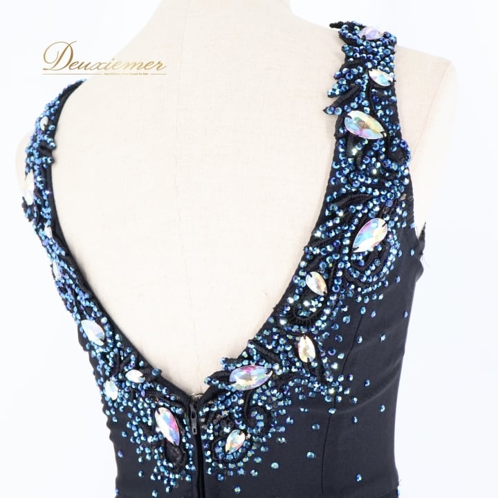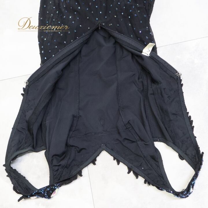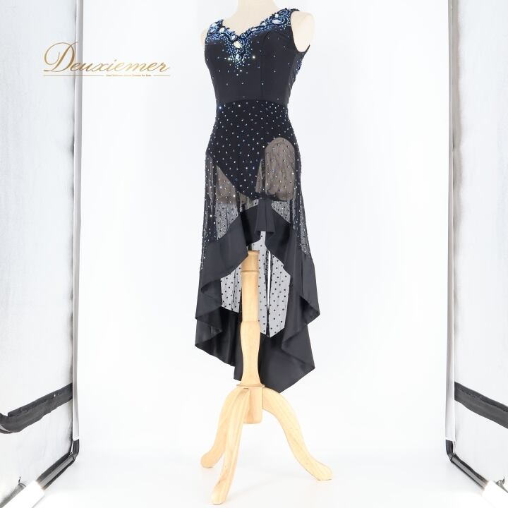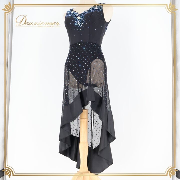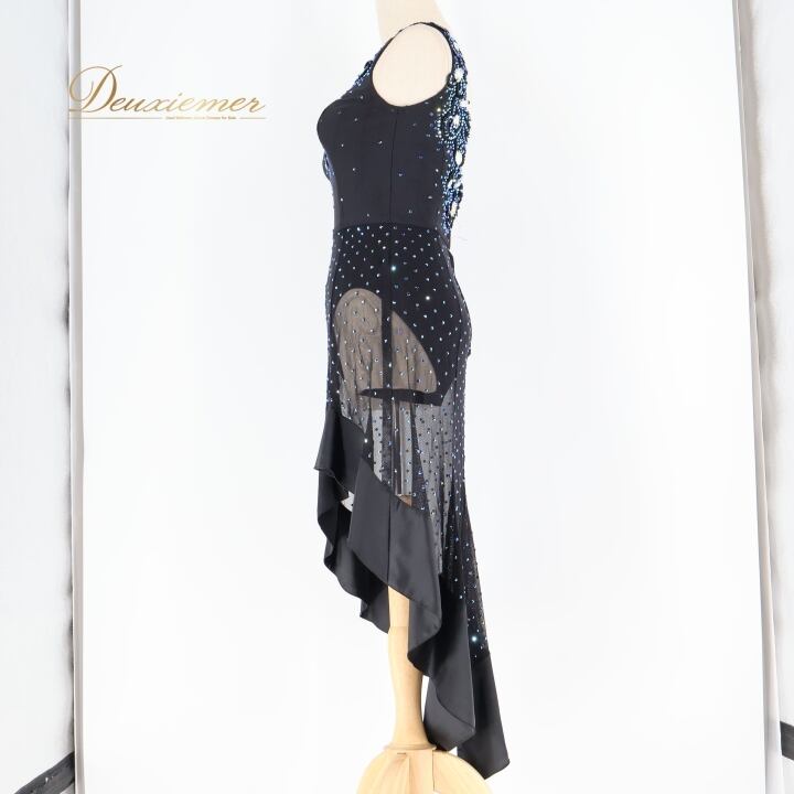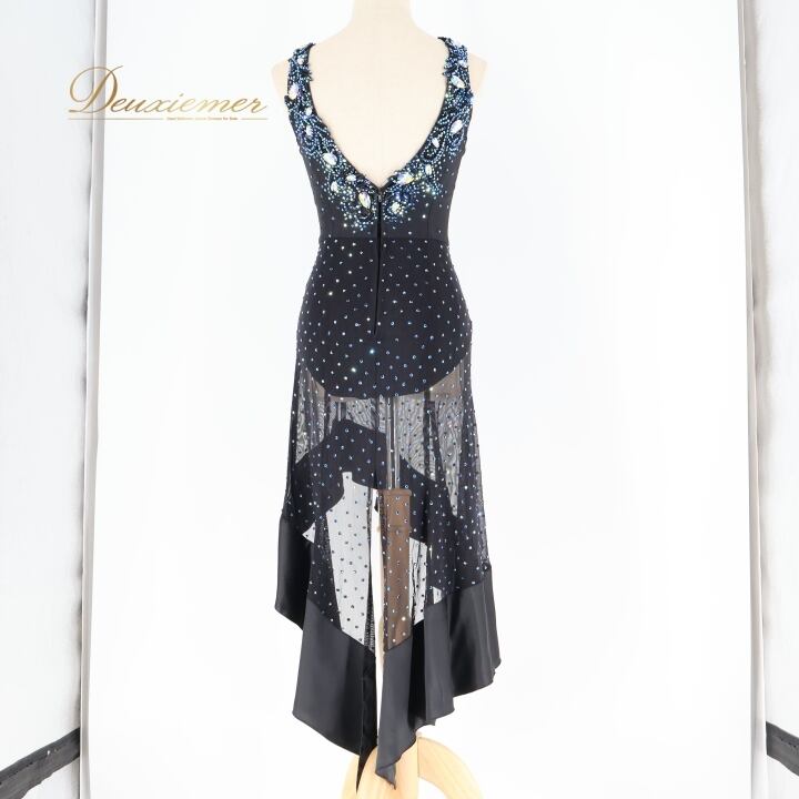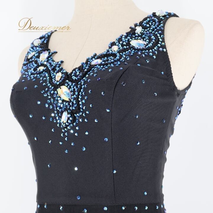 社交ダンス 衣装 ラテン ドレス ワンピース 黒 青 ブルー デモ 競技 透け感 軽い 薄い パーティ 発表会 ブラック系 ブルー系 スリット おしゃれ 動きやすい 軽量 エレガント 女性用 競技用衣装 フォーマル