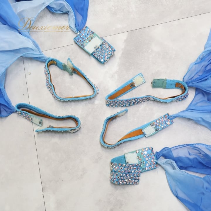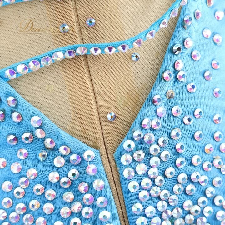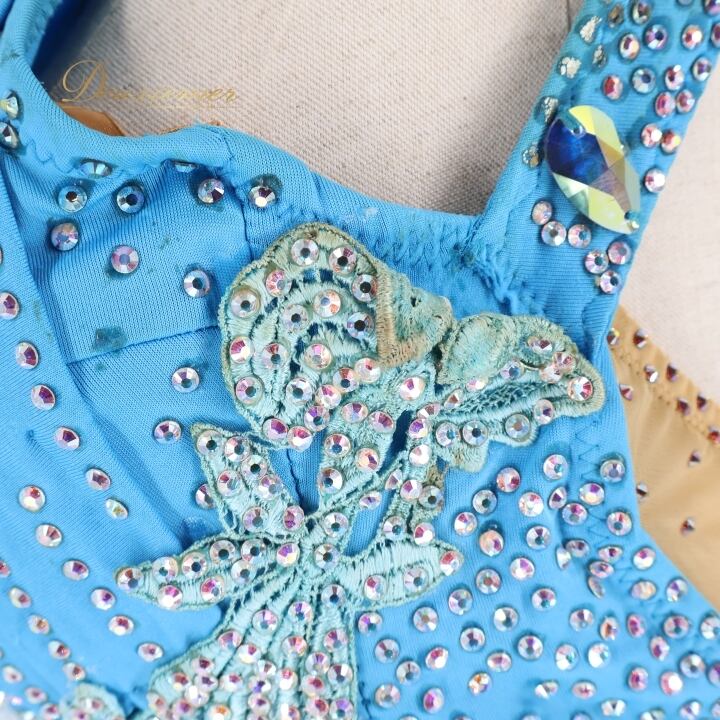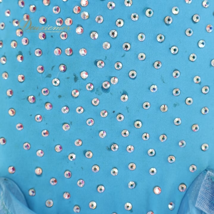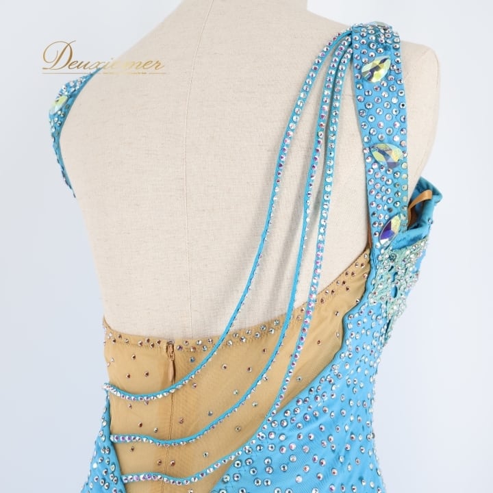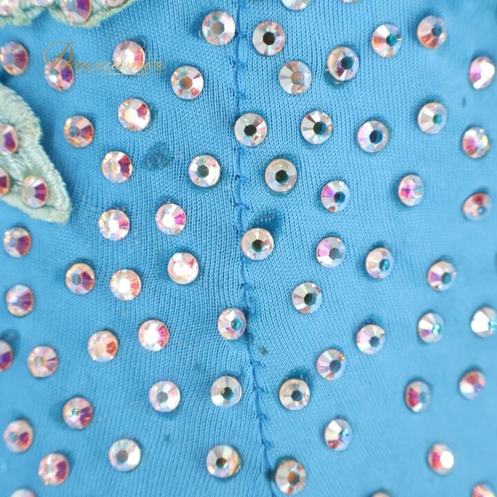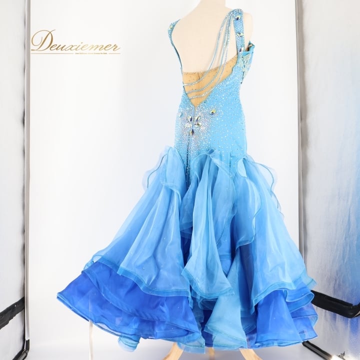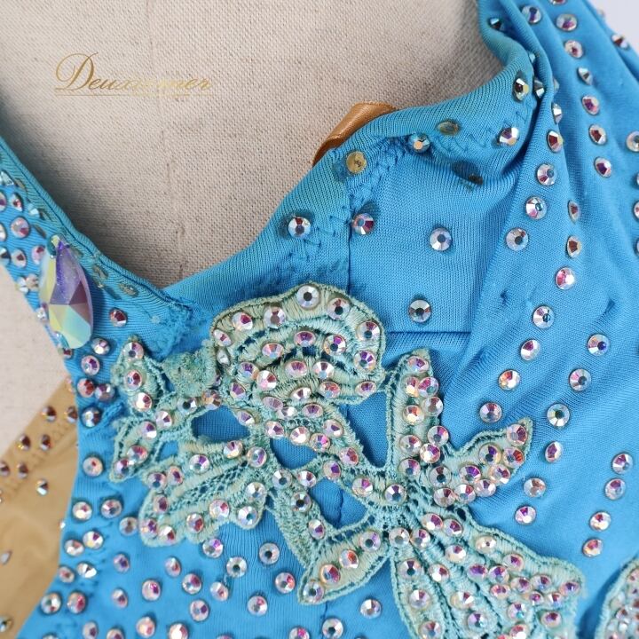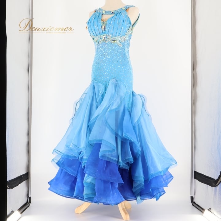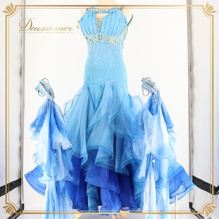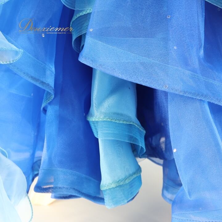 社交ダンス 衣装 スタンダードドレス ワンピース ドレス 水色 フロート デモ 競技 ダンス パーティ 発表会 フリル レース 青 ブルー系 スカート 発表会用 レディース フォーマル コスチューム フェミニン ロマンティック おしゃれ エレガント ステージ 競技用 ダンス衣装