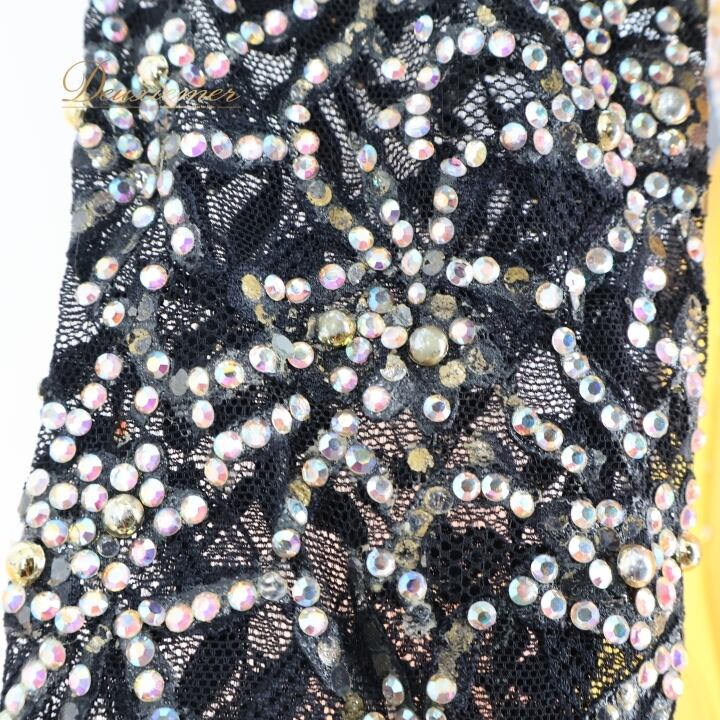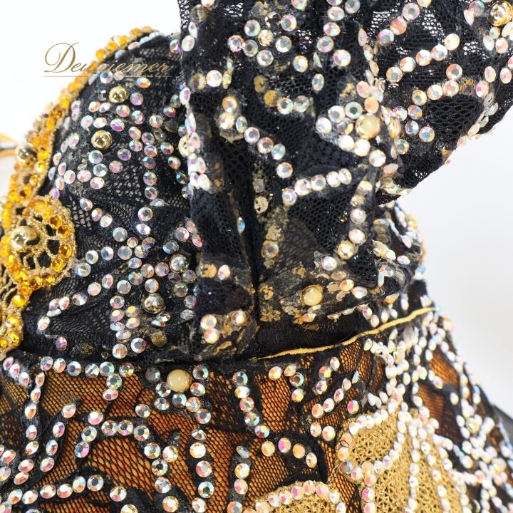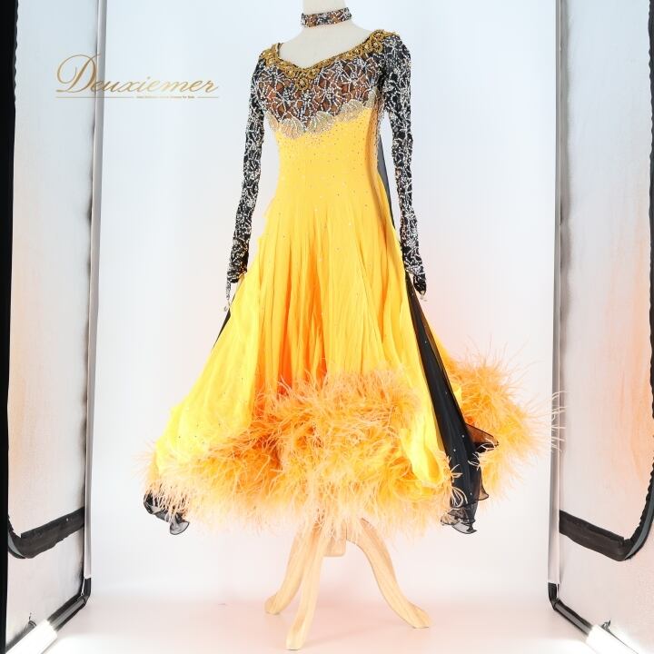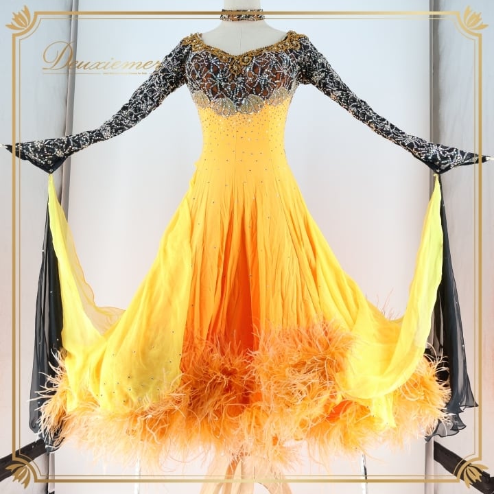 社交ダンス 衣装 スタンダードドレス ドレス ワンピース フロート オレンジ 黒 ファー レース デモ 競技 ダンス パーティ 発表会 ブラック系 オレンジ系 豪華 デザイン フロートスカート 女性用 ステージ衣装 フェス キラキラ おしゃれ 発表用 パフォーマンス
