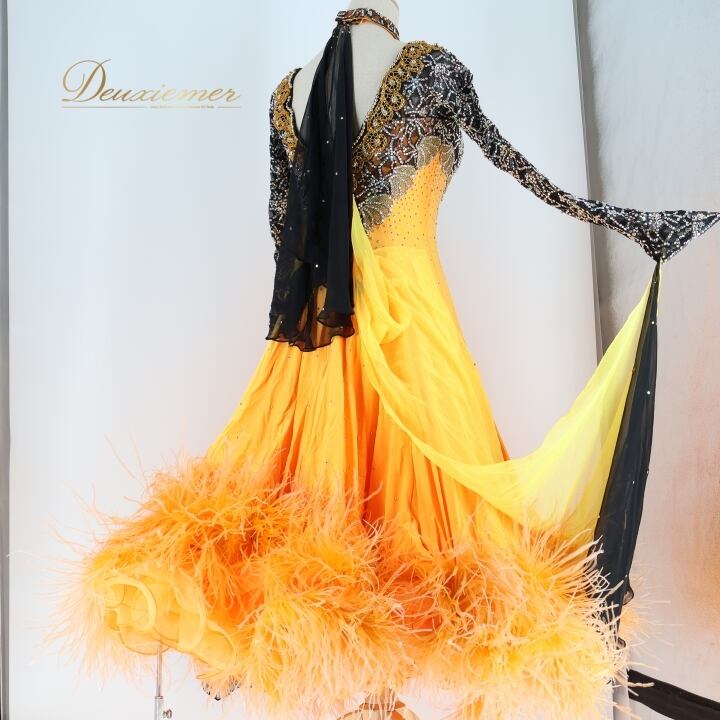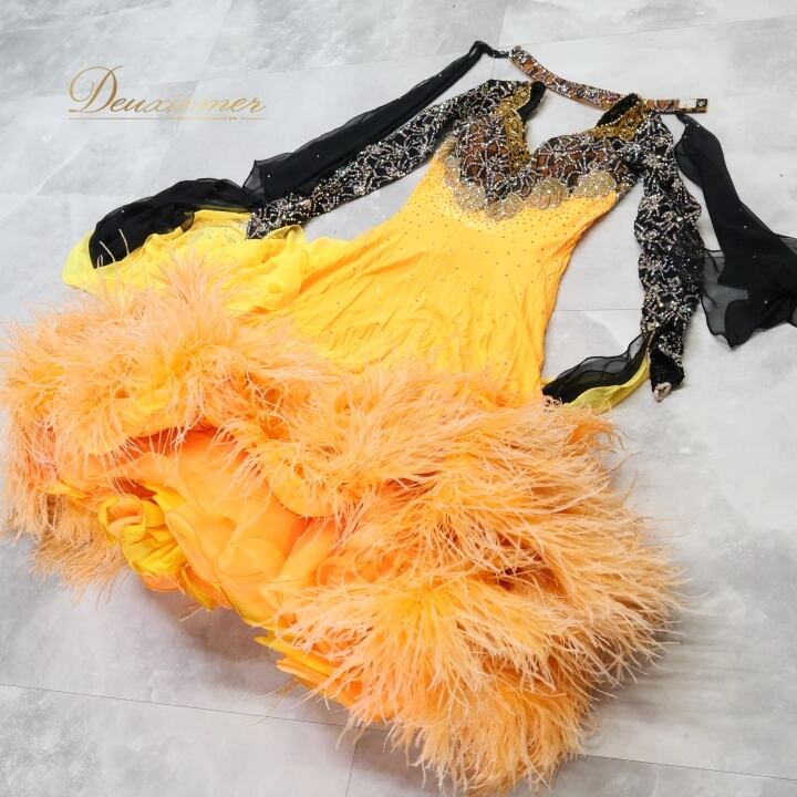 #社交ダンス #ダンス衣装 #ワンピース #ドレス #フロート #ファー #オレンジ #黒 #華やか #ダンスファッション #コスチューム #女性用衣装 #パーティードレス #おしゃれ #ダンススタイル #スポーツダンス #バルカーダンス #衣装販売 #フォーマル #ENUTSU