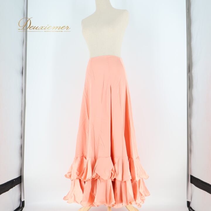 #フラメンコ #衣装 #ペチコート #スカート #サーモンピンク #かわいい #光沢感 #ダンス衣装 #舞台衣装 #ファッション #トルソー #女性用 #伸縮性無し #背面ファスナー #コスチューム #フラメンコダンス #オシャレ #スカートスタイル #特別な日 #ENUTSU