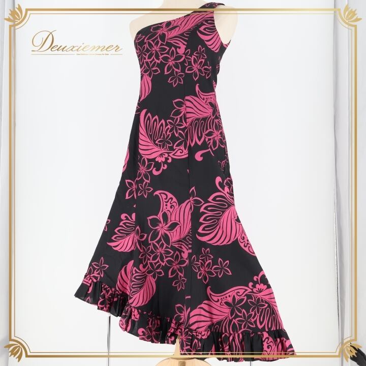 フラダンス 衣装 ワンピース ドレス CC Fashions ブラック系 ハワイ製 ワンショルダー ツーカラー アシンメトリー フリル モンステラ柄 プルメリア柄 かわいい 華やか 鮮やか ハワイアン アロハ ハワイアンプリント フラ ダンス レッスン 練習