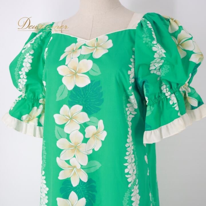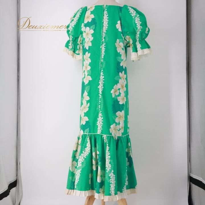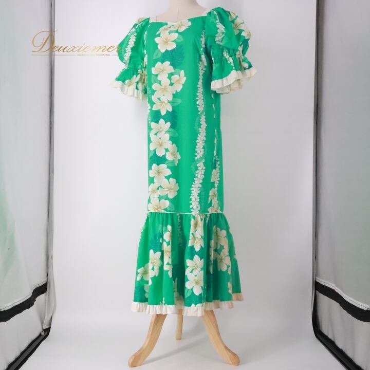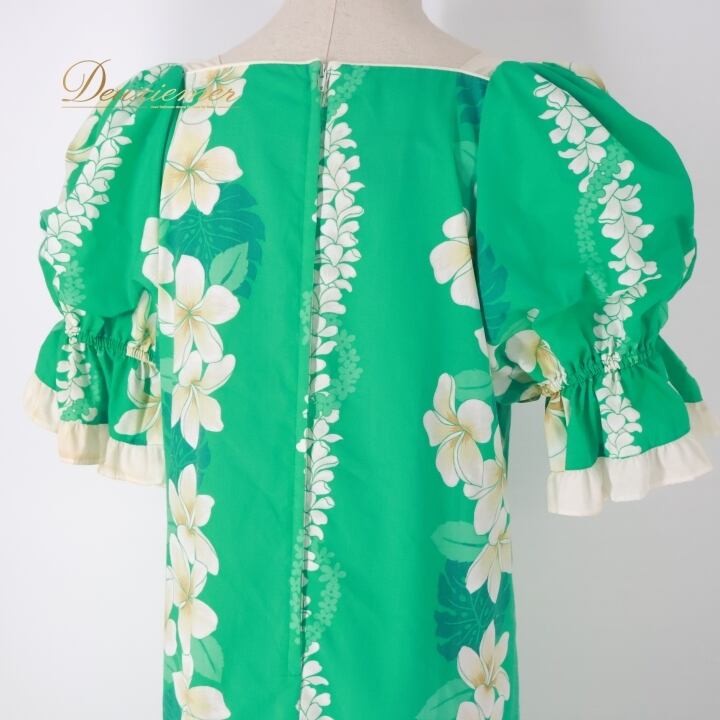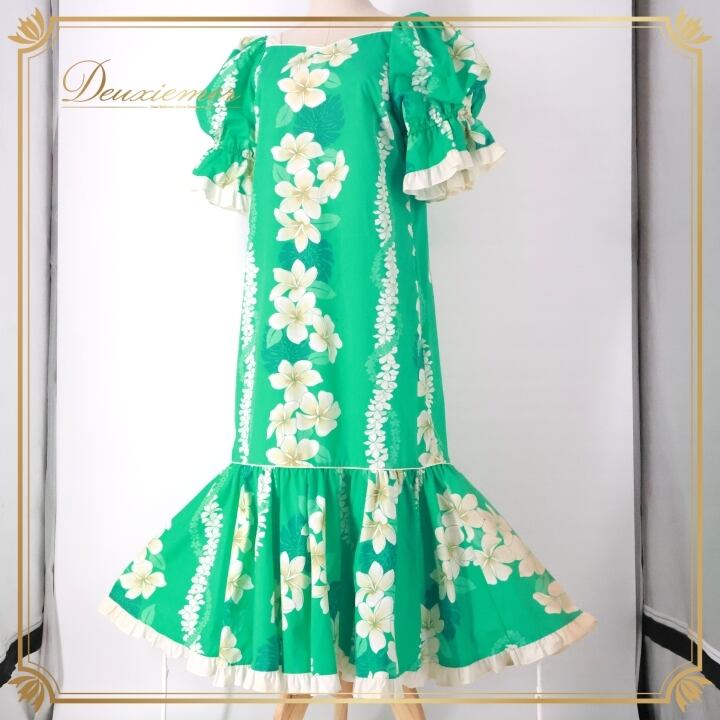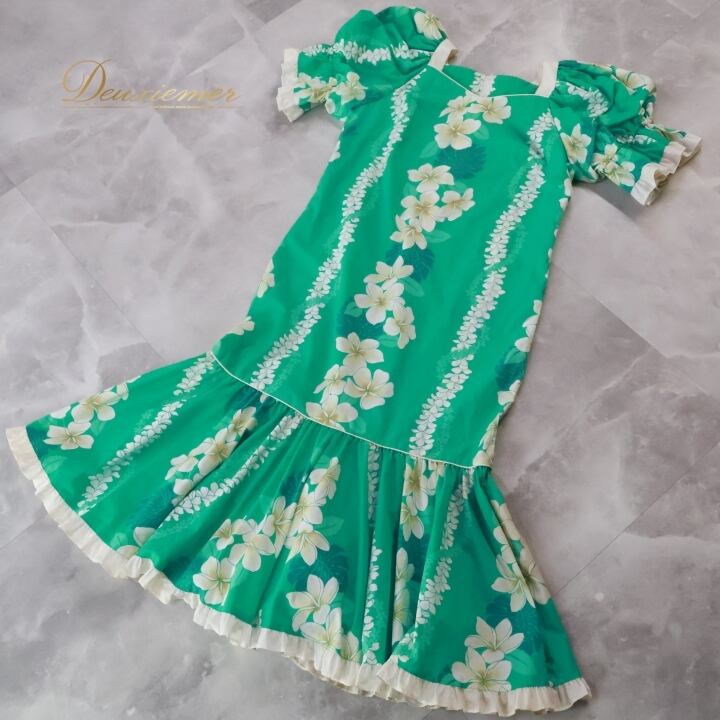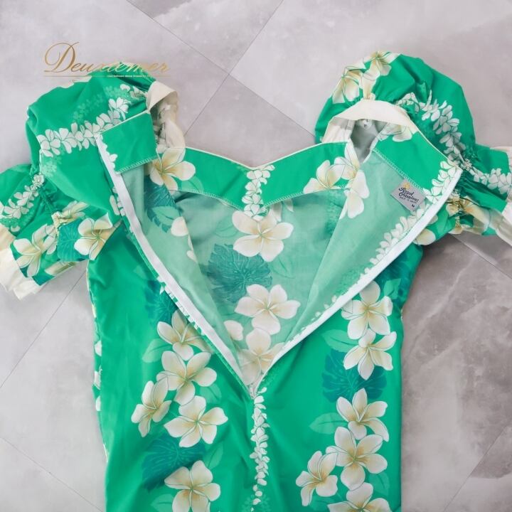 #フラダンス #フラダンス衣装 #ハワイ #ワンピース #ドレス #プルメリア #グリーン #ポリエステル #コットン #Mサイズ #背面ファスナー #伸縮性無し #RoyalCreations #かわいい #夏ファッション #ダンス衣装 #レディースファッション #トルソー #ハワイアン #ENUTSU