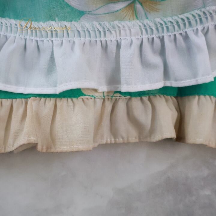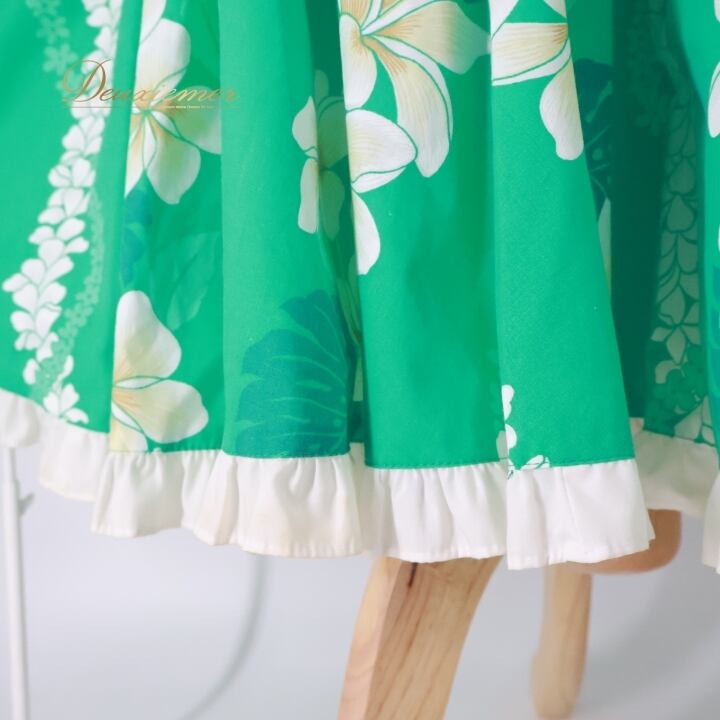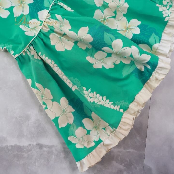 フラダンス 衣装 ワンピース ドレス グリーン系 Royal Creations ハワイ製 プルメリア柄 モンステラ柄 ハワイアンプリント アロハ フラ ダンス レッスン 練習 ホワイト系 緑 白 華やか 鮮やか フリル かわいい おしゃれ プリント ハワイアン リゾート ファッション