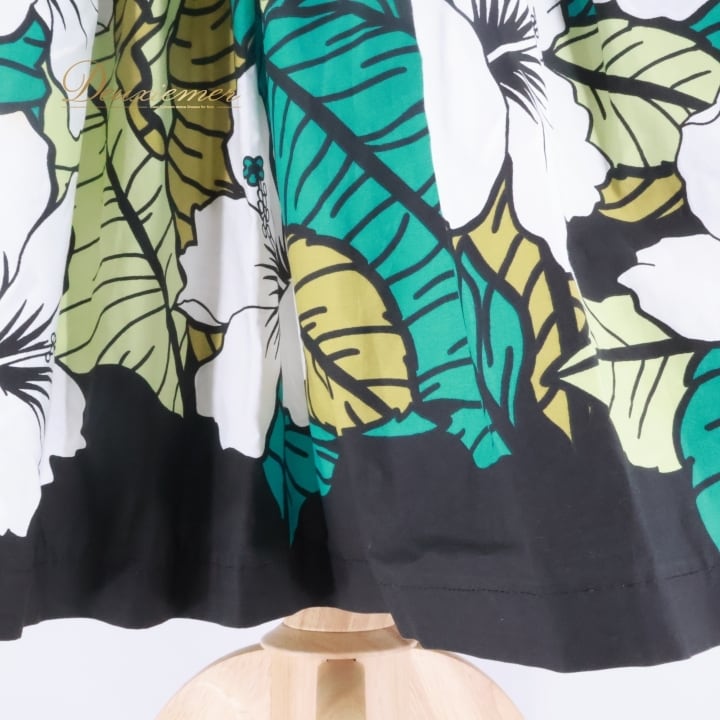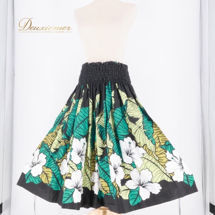 フラダンス 衣装 パウスカート ブラック系 シングル ハイビスカス柄 リーフ柄 グリーン系 かわいい 鮮やか 華やか 明るい ハワイアン アロハ ハワイアンプリント フラ ダンス レッスン 練習 エレガント カジュアル