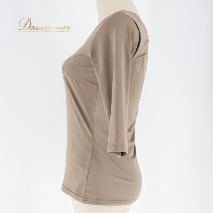 社交ダンス 衣装 トップス ブラウス カーキ系 チャコット Chacott ラインストーン レッスン 練習 ストレッチ 伸縮 茶 ブラウン 落ち着いた色 かわいい キラキラ 七分袖