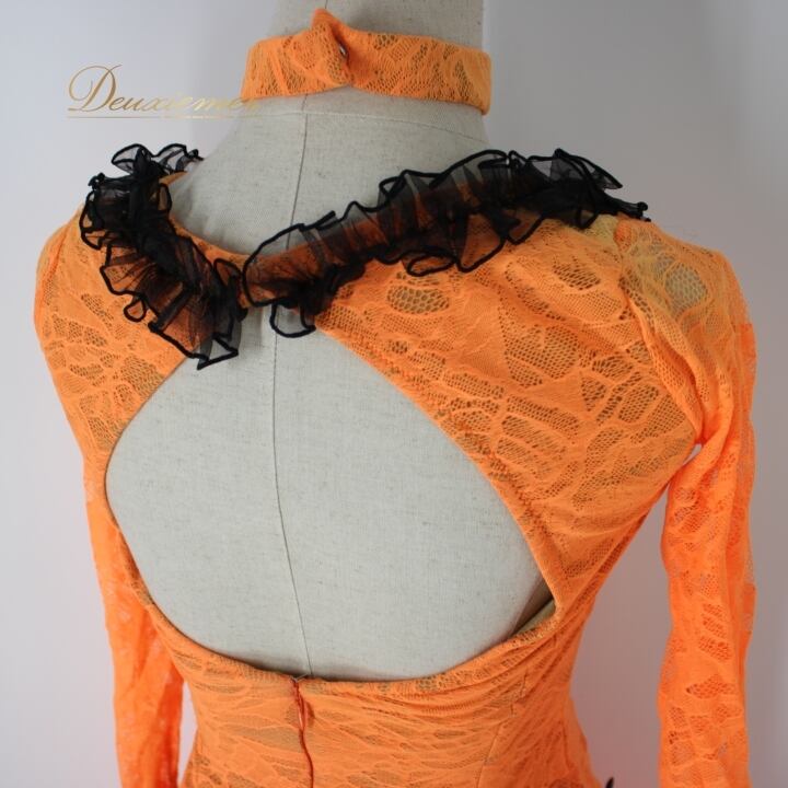 社交ダンス 衣装 ラテン ドレス ワンピース パーティ衣装 レディース SEKINE セキネ 黒 ブラック系 オレンジ系 リボン レース 長袖 派手 フォーマル コスチューム 蛍光色 日本製 大人可愛い チョーカー付き ゆったり 伸縮性 おしゃれ パーティー お出かけ 女性用 サイズM 斜めデザイン きれい シンプル クラシック 感謝祭 忘年会 ファッション 特別イベント