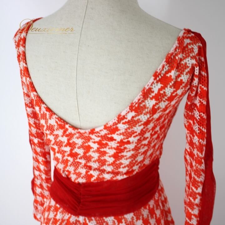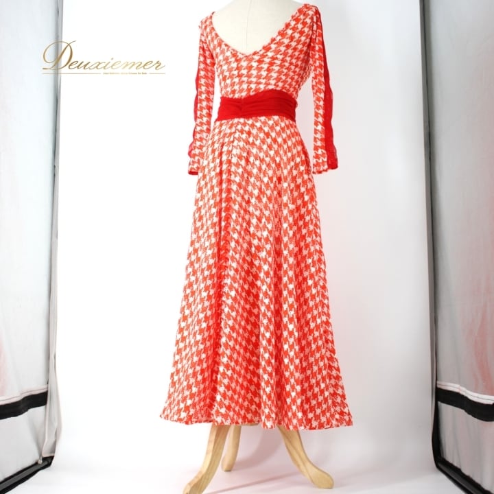 社交ダンス 衣装 スタンダード ドレス ワンピース レッスンウェア パーティドレス レディース レッド系 赤 朱色 千鳥格子 長袖 ラインストーン フォーマル ドレスアップ おしゃれ 体型カバー エレガント 踊りやすい ファッション ハイウエスト ひざ丈 薄手 ストレッチ 特別な日 パーティーワンピース 伸縮性 きれいめ 安いコスチューム レディースファッション
