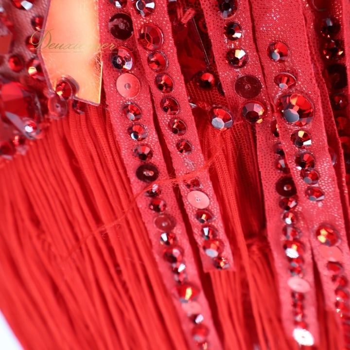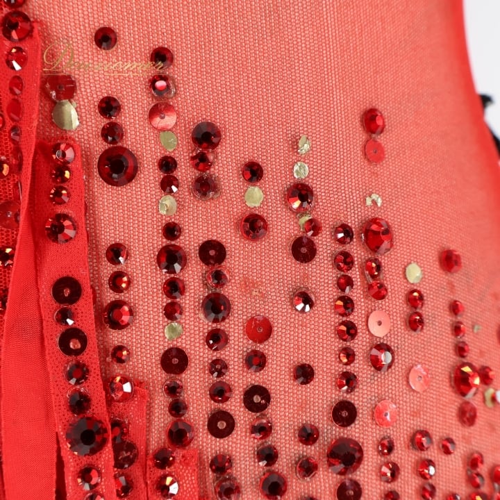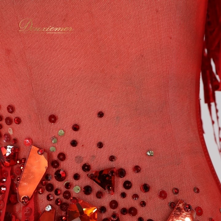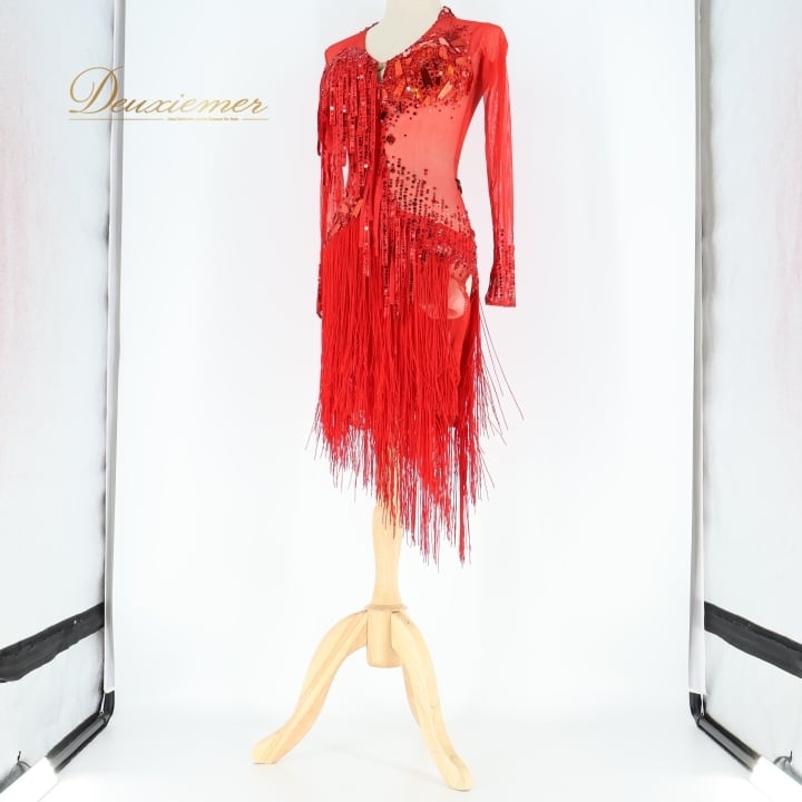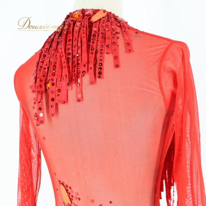 社交ダンス 衣装 タカダンス TAKADANCE ラテン ドレス ワンピース 赤 フリンジ デモ 競技 レース 発表会 パーティ レッド系 競技用ドレス パーティドレス フリンジデザイン 鮮やか 赤いドレス ラテン衣装 ダンス衣装 女性 衣装発表会 デモ用衣装 透け感 おしゃれ 社交ダンス用