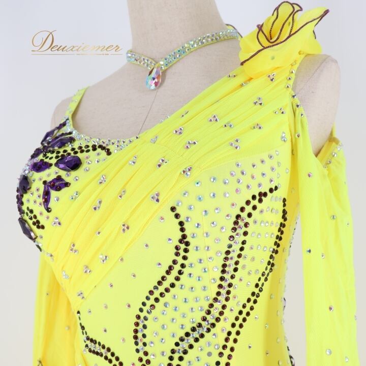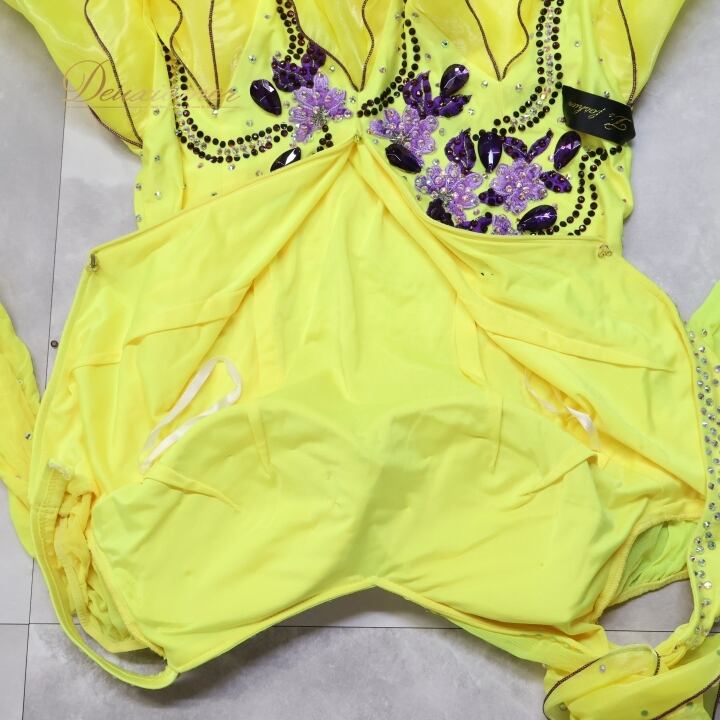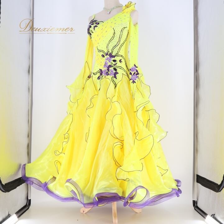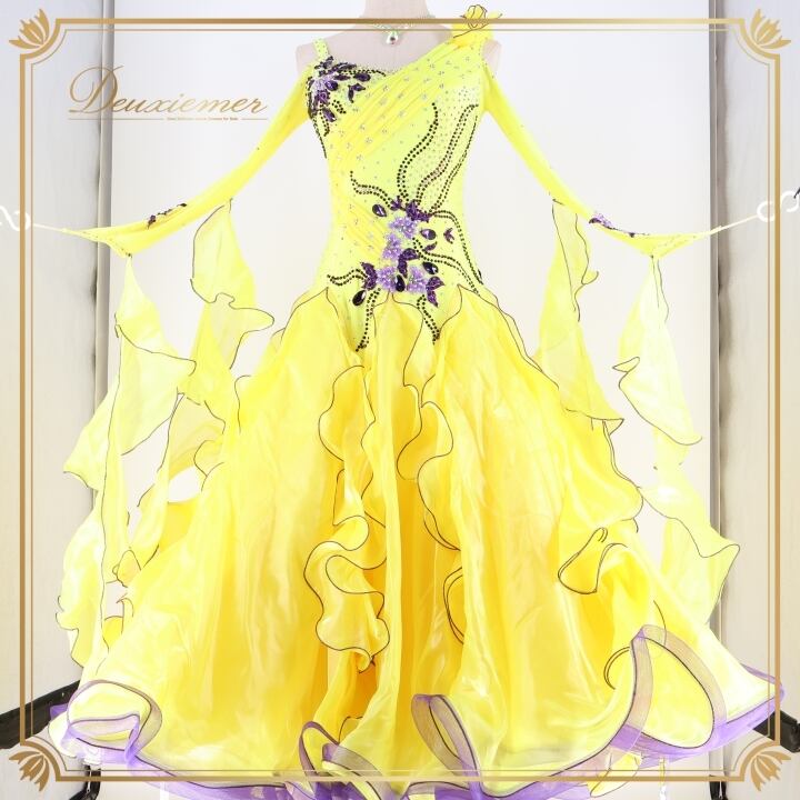社交ダンス 衣装 スタンダードドレス ワンピース ドレス スタンダード 黄色 フロート レース フリル 光沢 紫 イエロー系 パープル系 デモ 競技 パーティ 発表会 スカート 重ね着 上品 おしゃれ 女性用 衣装 ドレスアップ 発表会用 光沢感 楽しい レディース