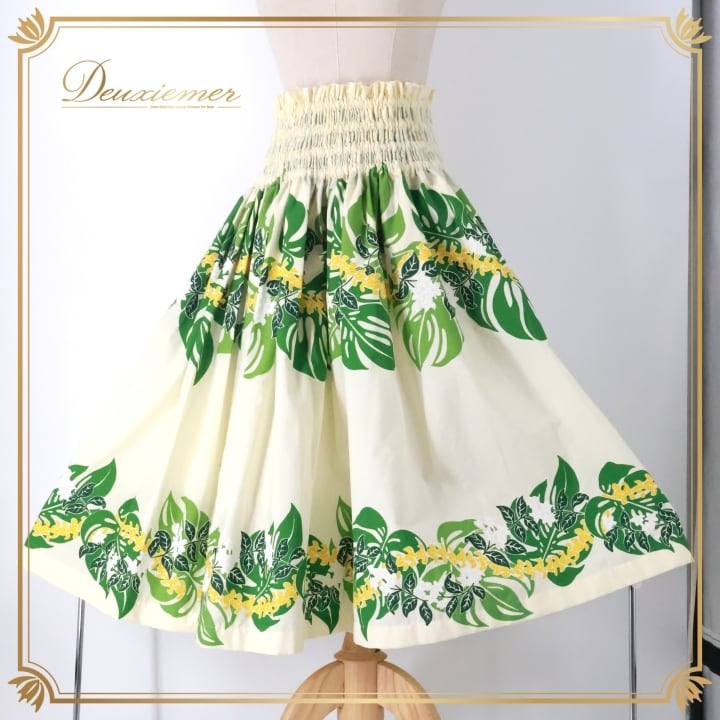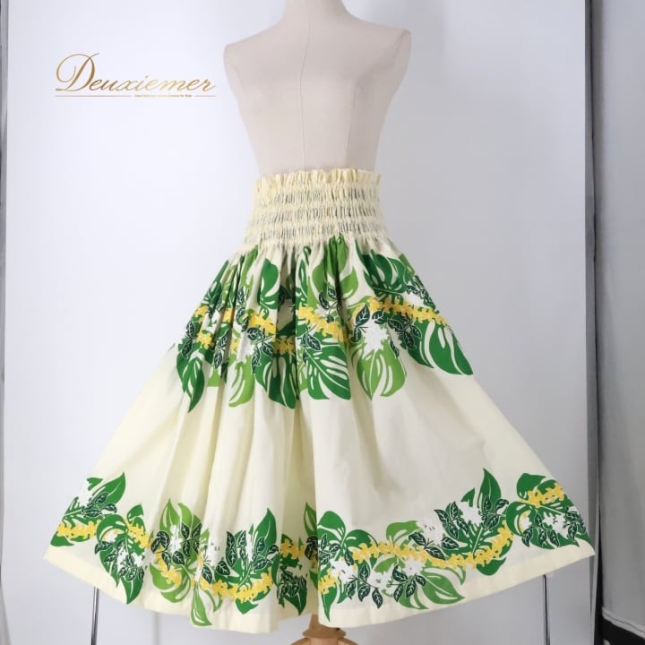 フラダンス 衣装 パウスカート ホワイト系 モンステラ柄 ハワイアンプリント アロハ フラ ダンス レッスン 練習 シングル スカート 軽やか ふんわり グリーン系 白 緑 黄緑 黄 華やか 鮮やか かわいい おしゃれ さわやか フラダンス スカート おしゃれ モンステラ ハワイアン 軽量 上品 ふんわりデザイン