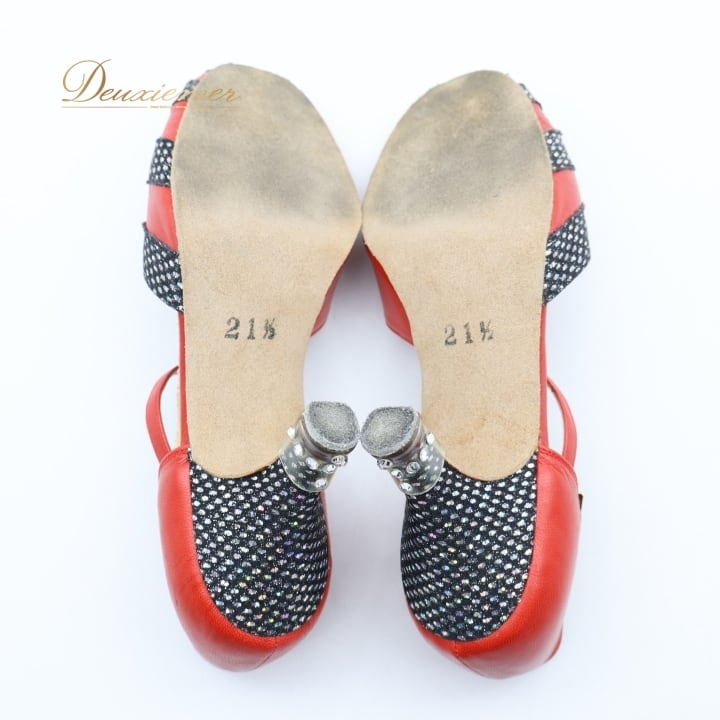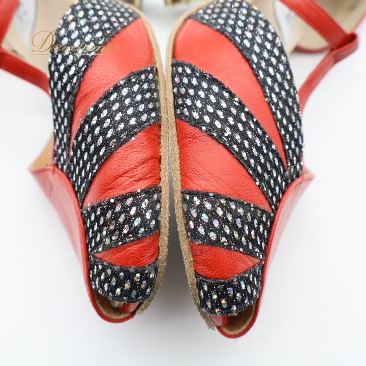 社交ダンス 衣装 シューズ 21 1/2サイズ レッド系 Fancy dance 日本製 靴 くつ ヒール 赤 黒 キラキラ オープントゥ ラテン レディース ストラップ 練習 レッスン 華やか 上品 かわいい ダンス衣装 ステージ イベント ブラック系