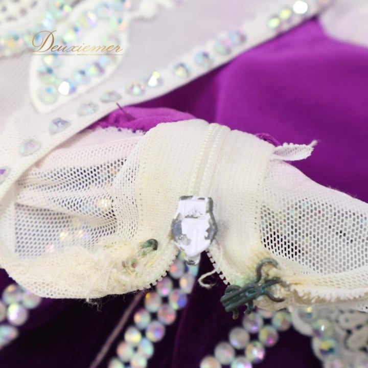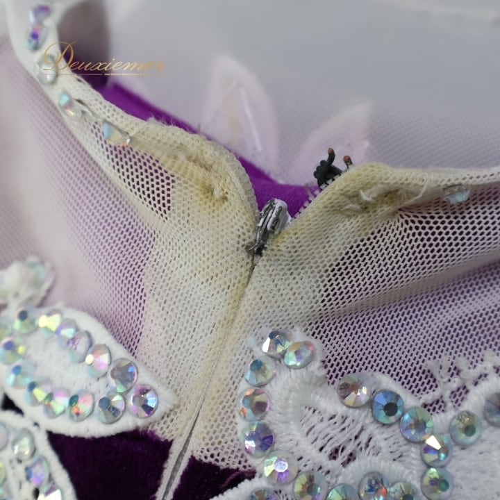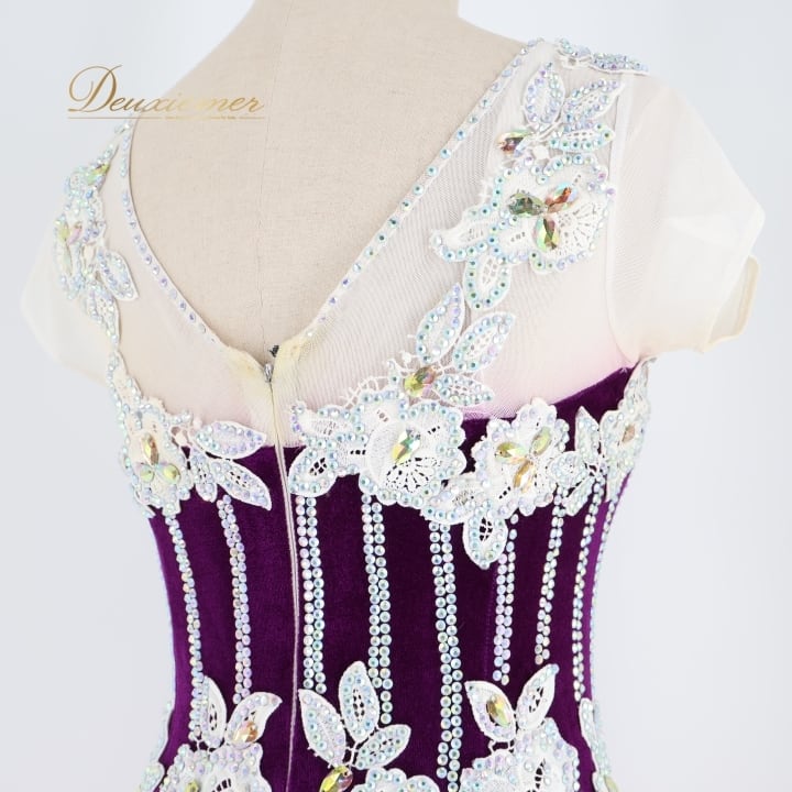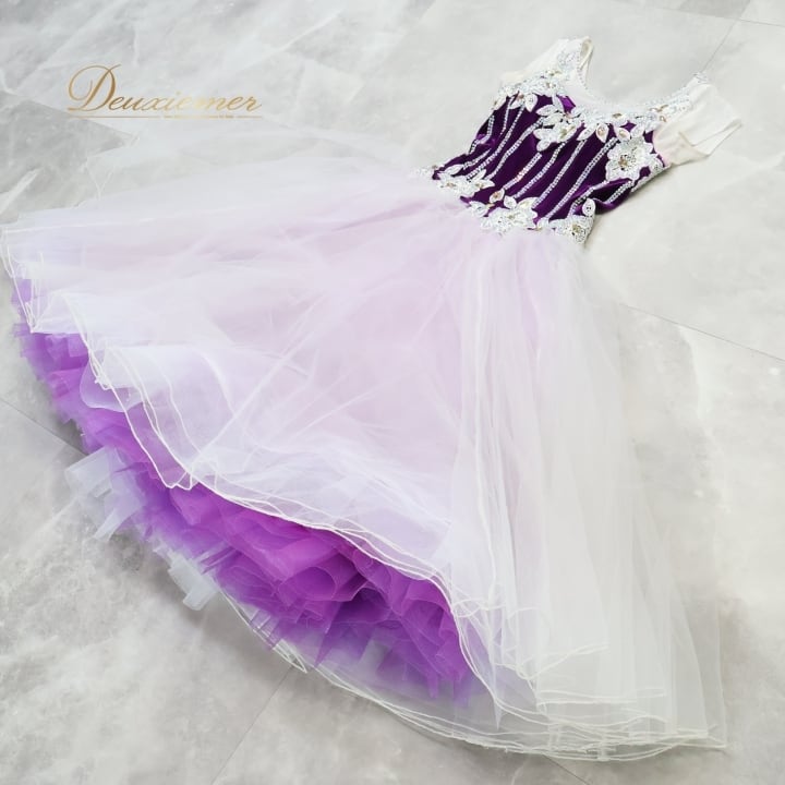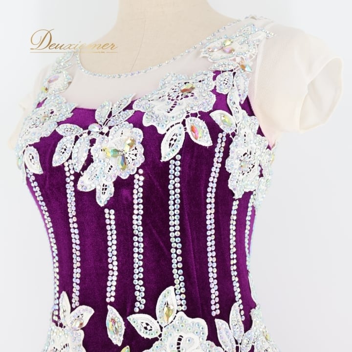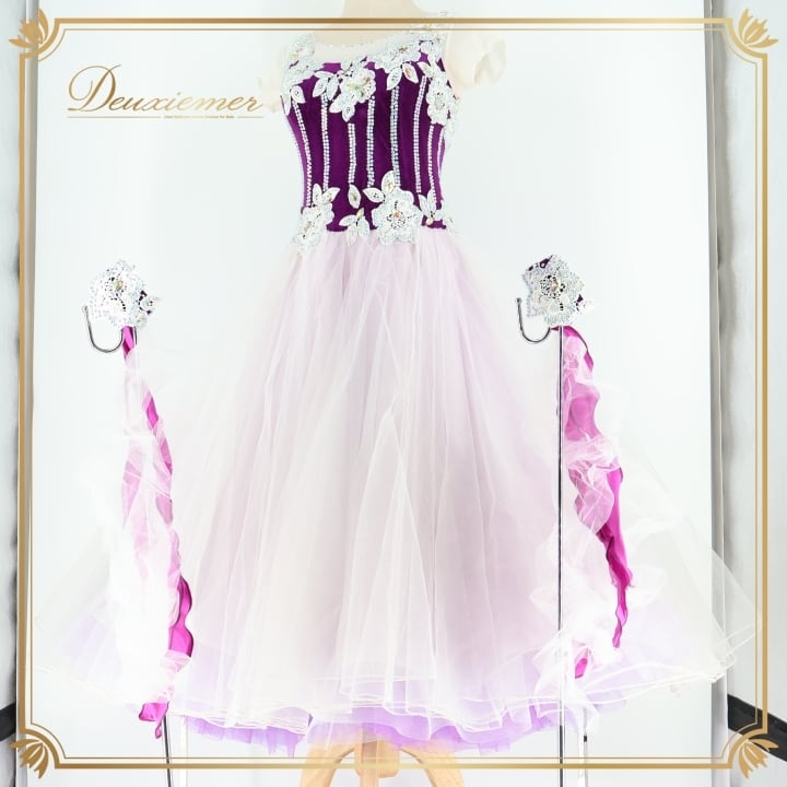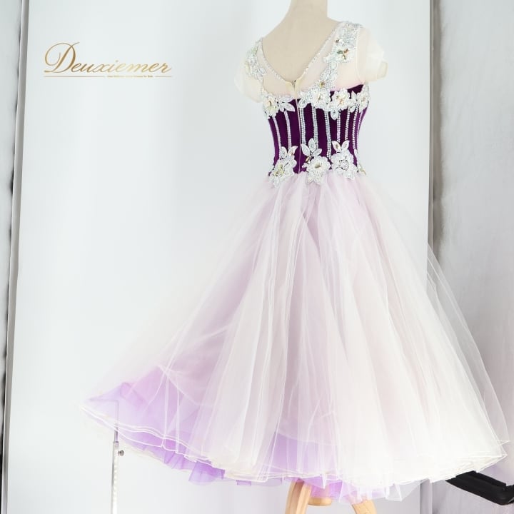 社交ダンス 衣装 スタンダードドレス ワンピース ドレス スタンダード デモ 競技 ダンス パーティ 発表会 紫 ベロア チュール フロート パープル系 ホワイト系 ふんわり スカート ボリューム 高級感 胸パッド 3枚重ね 膨らむ フロートバングル 伸縮性 ドレスアップ おしゃれ 競技用 フェスティバル コスチューム ステージ