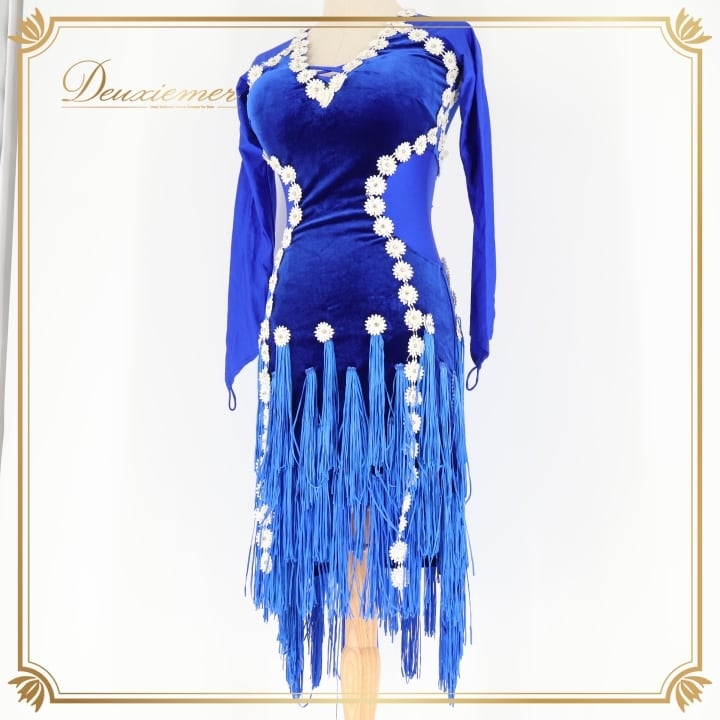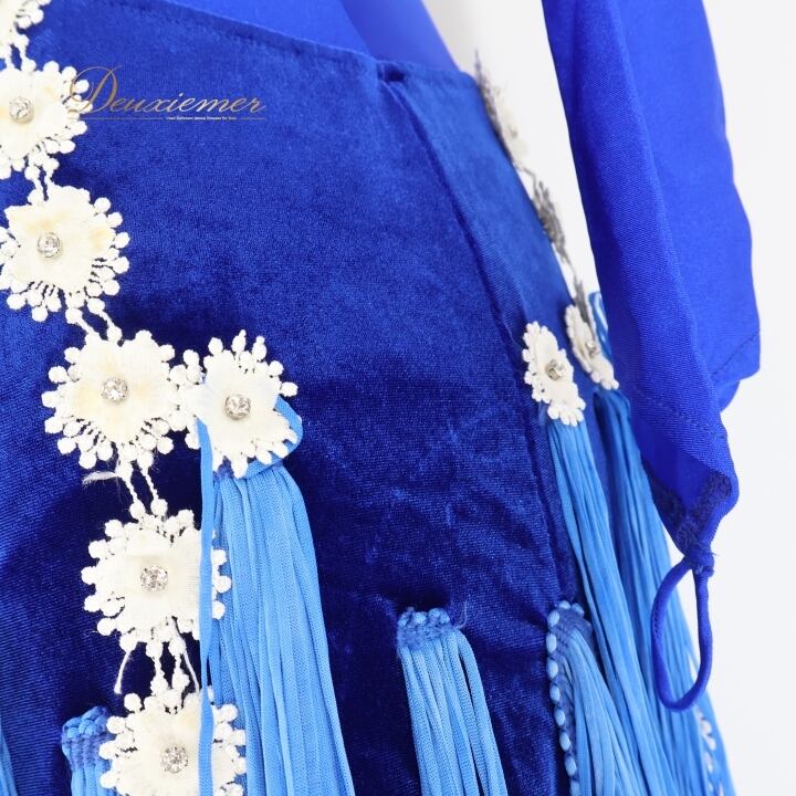 社交ダンス 衣装 ラテン ドレス ワンピース 青 フリンジ ベロア 花 デモ 競技 高級感 パーティ 発表会 ブルー系 フリンジドレス ストレッチ 伸縮性 レディース 社交ダンス衣装 高級素材 デモ用 ダンス衣装 フェミニン おしゃれ 大人用 フォーマル ショートドレス 競技会用 パーティー服