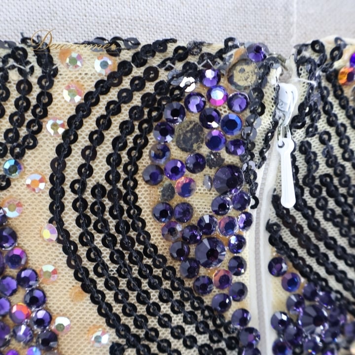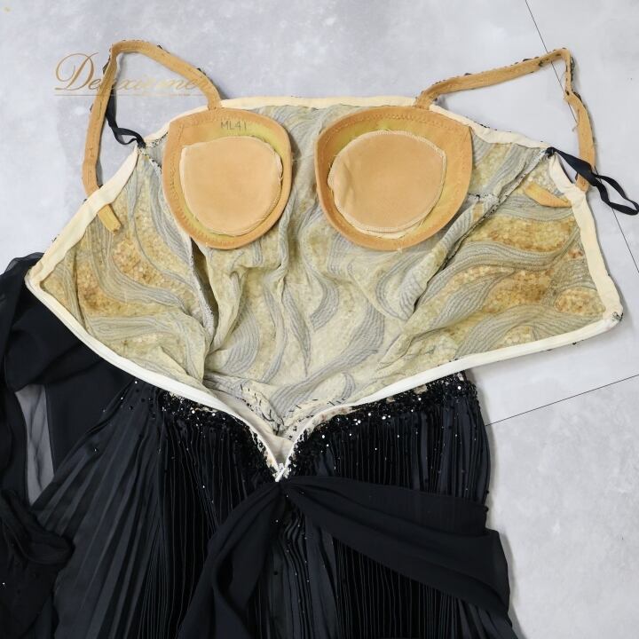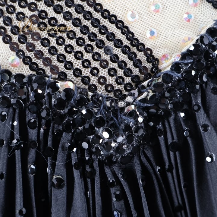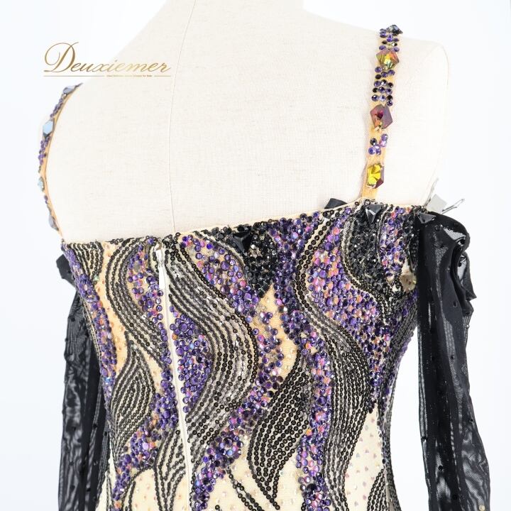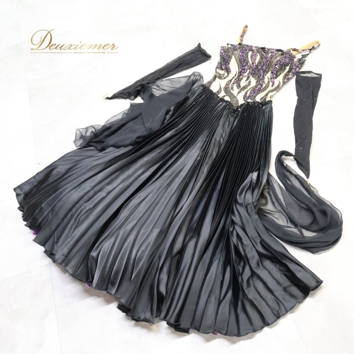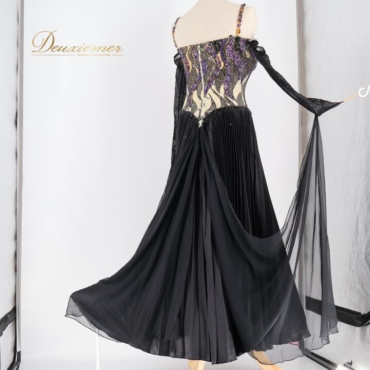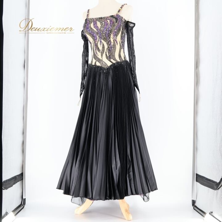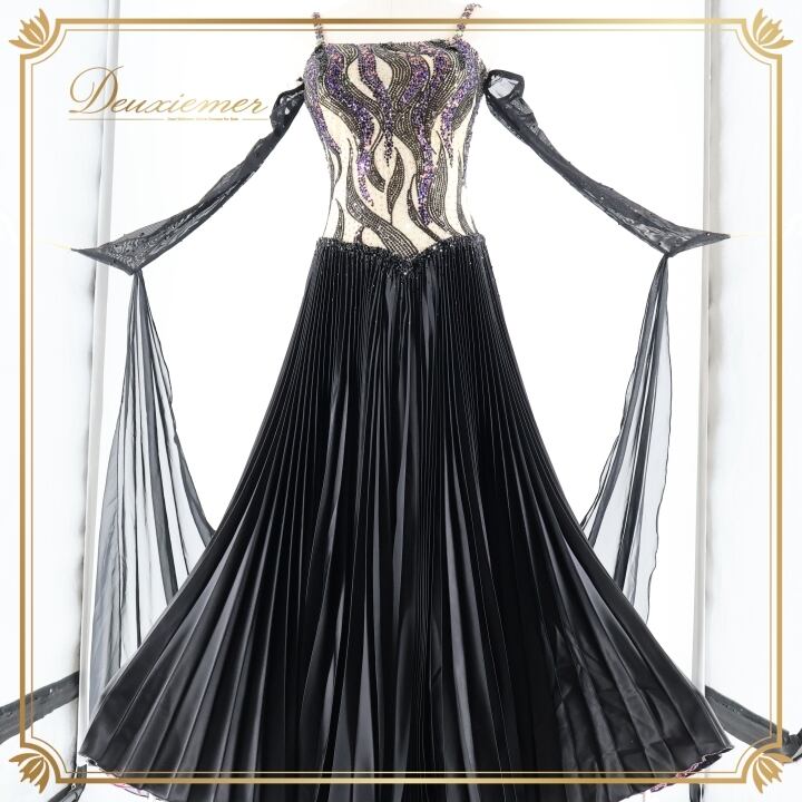 社交ダンス 衣装 DSI スタンダードドレス ワンピース ドレス スタンダード フロート プリーツ 紫 黒 デモ 競技 ダンス パーティ 発表会 上品 高級感 クロッチ ブラック系 パープル系 光沢感 フォーマル 舞台衣装 ダンスイベント オシャレ お洒落