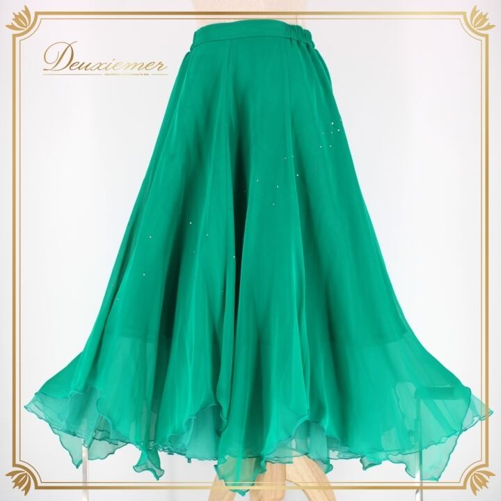 社交ダンス 衣装 スタンダード スカート レッスンウェア レディース 練習着 グリーン系 緑 Sanline サンリーヌ ラインストーン 上品 エレガント フレッシュ ボリューム 優雅 78cm ウエスト33.5cm ポリエステル 日本製 二重スカート ラインストーン付き