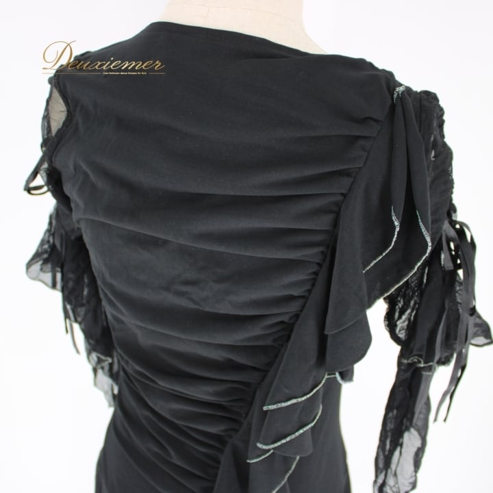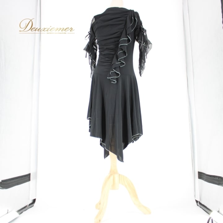 社交ダンス 衣装 ラテン ドレス ワンピース レッスンウェア パーティドレス prima boutique プリマブティック ブラック系 黒 フリル スポーツウェア おしゃれ 伸縮性 着心地 おすすめ フェミニン エレガント トレンド 袖リボン デザイン レディース ダンス用 衣装 ブラックドレス パーティー用 さりげないアクセント 高品質 ポリエステル ブランド品 お洒落 競技用 発表会 旅行用