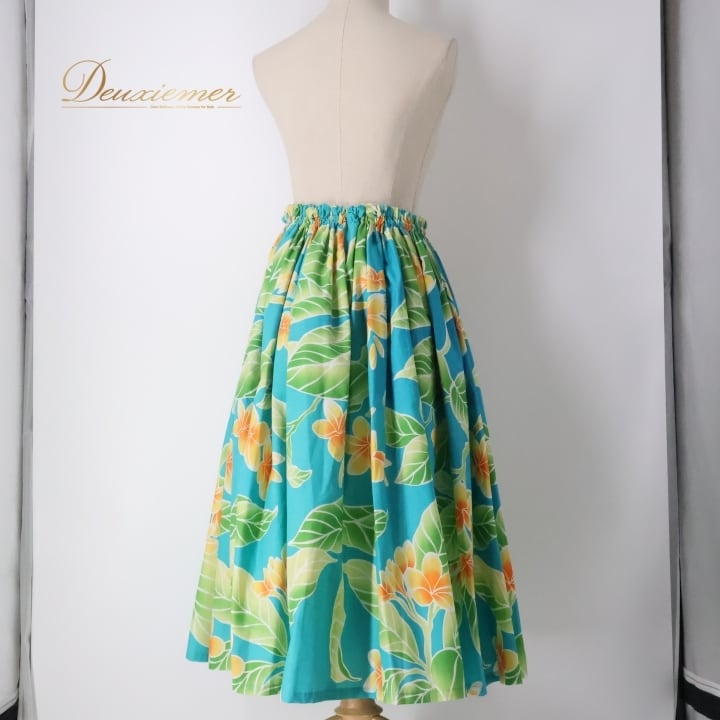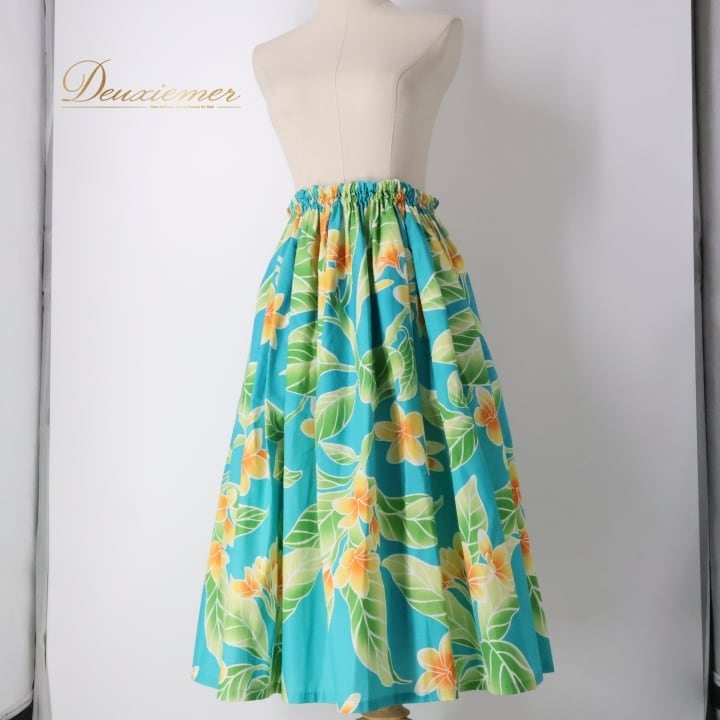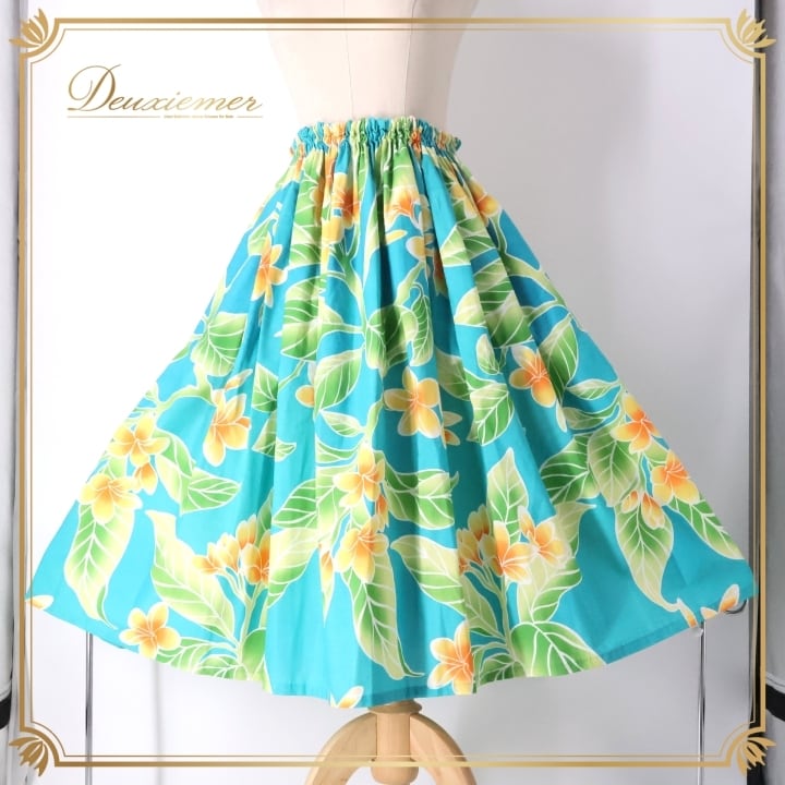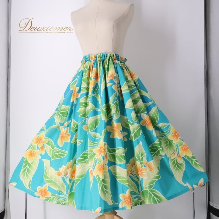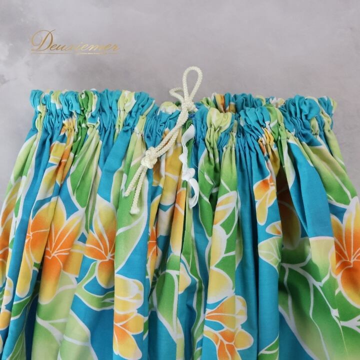 フラダンス 衣装 パウスカート ブルー系 プルメリア柄 ハワイアンプリント フラ ダンス レッスン 練習 シングル スカート ふんわり 軽やか さわやか かわいい おしゃれ 上品 華やか 鮮やか グリーン系 オレンジ系 ホワイト系 水色 黄緑 橙 白 フレアスカート ハワイ アロハ リゾート