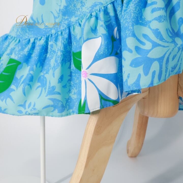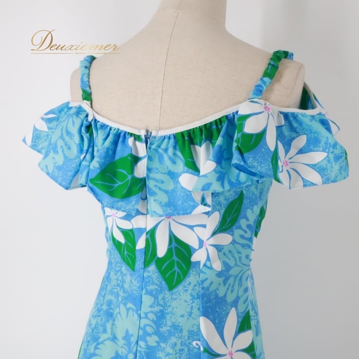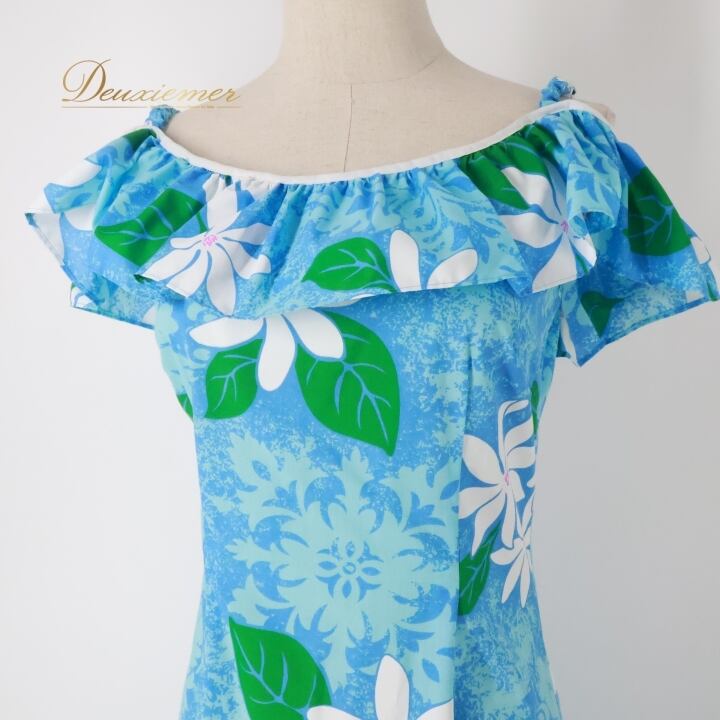 フラダンス 衣装 ワンピース ドレス ブルー系 マカマカ ティアレ柄 ハワイアンプリント MakaMaka アロハ フラ ダンス レッスン 練習 グリーン系 ホワイト系 水色 緑 白 華やか 鮮やか さわやか かわいい おしゃれ 上品 フラダンス衣装 ハワイアンドレス リゾート フラレッスン アロハシャツ オシャレ フラダンスイベント