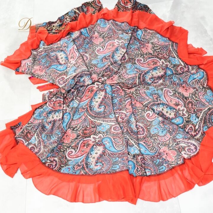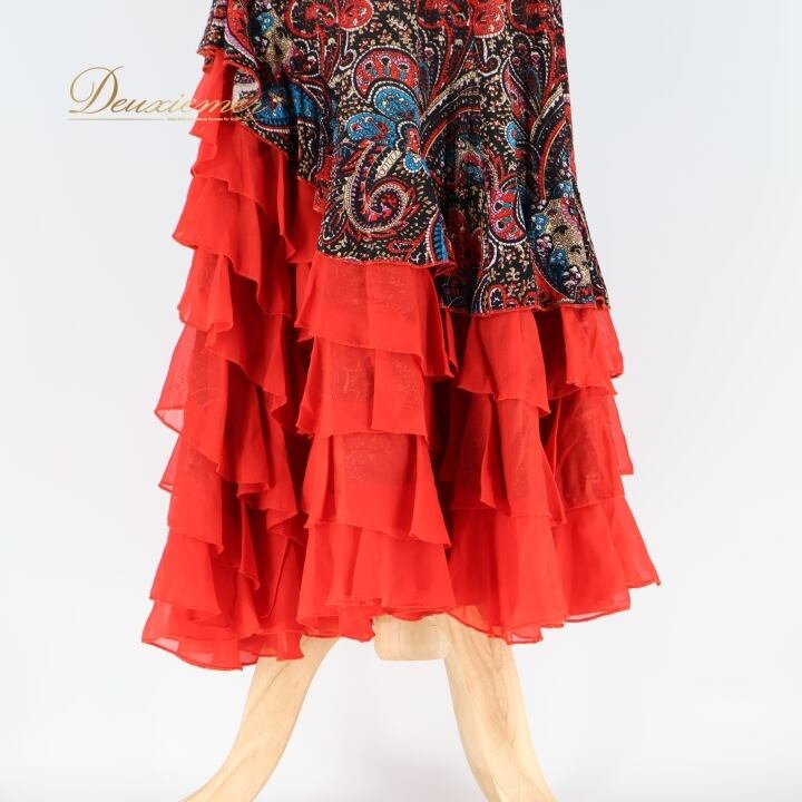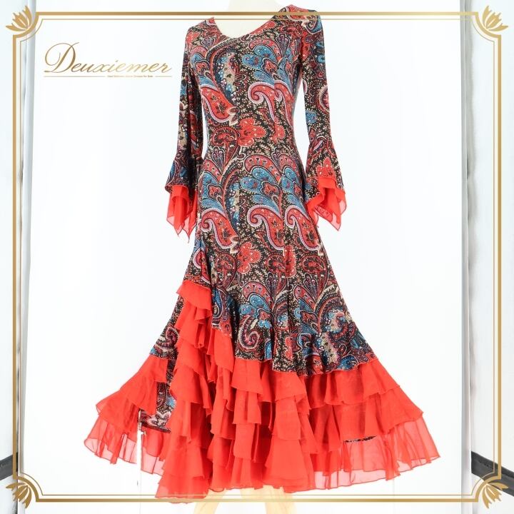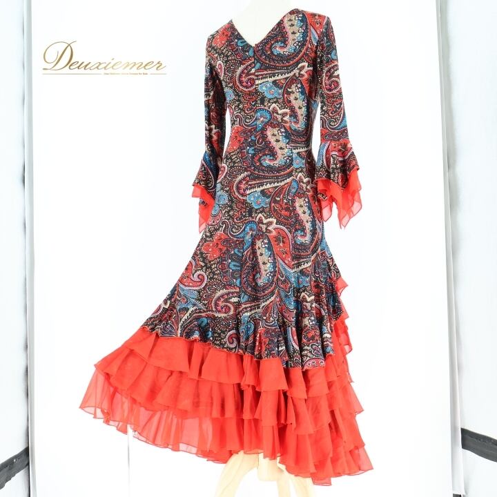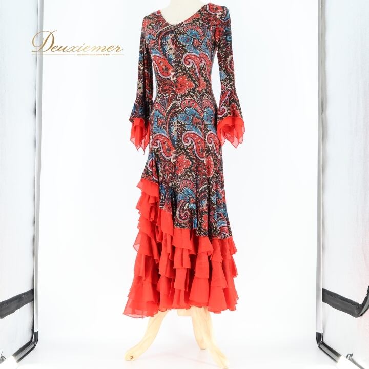 フラメンコ 衣装 ワンピース ドレス トップス 赤 黒 ペイズリー レース ダンス 柄 模様 伸縮 パーティ 発表会 舞台 ブラック系 レッド系 ボリュームアップ 華やか デザイン イベント 舞台衣装 コスチュームレディース 服装