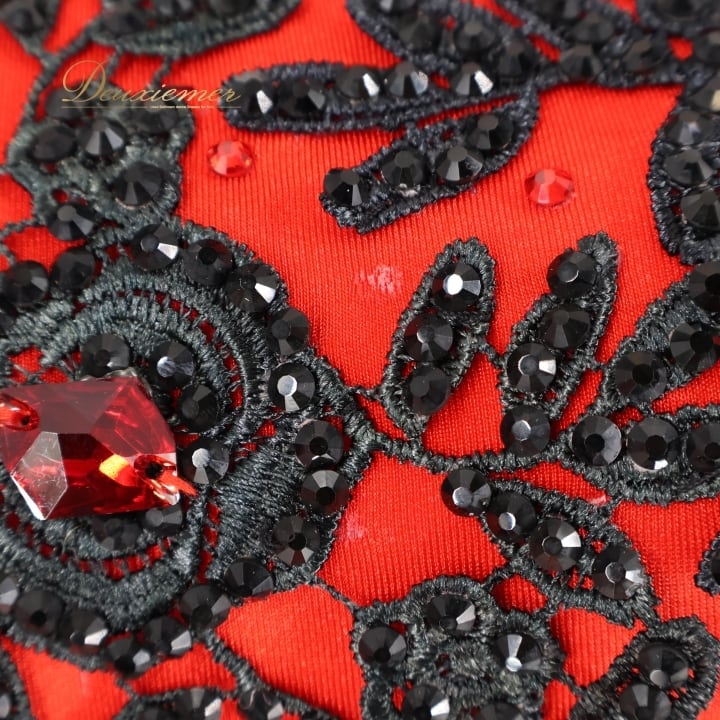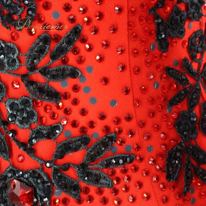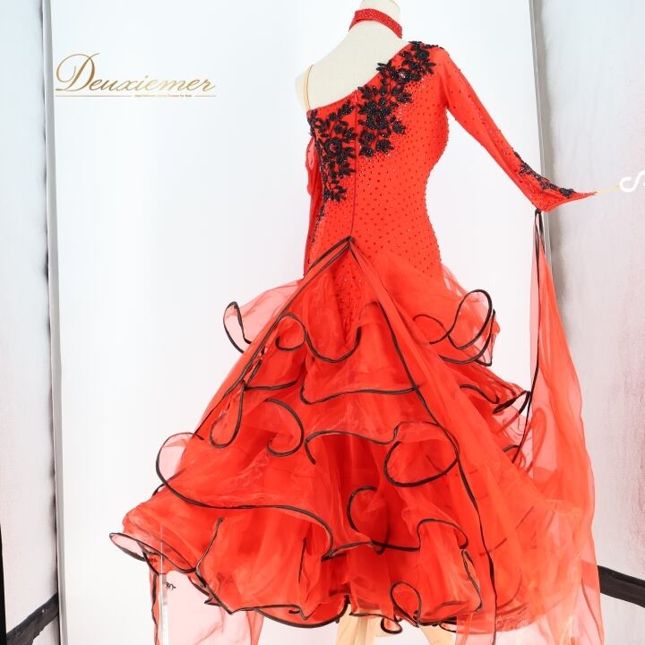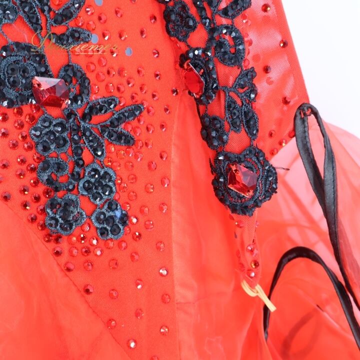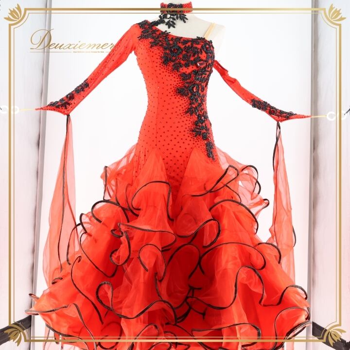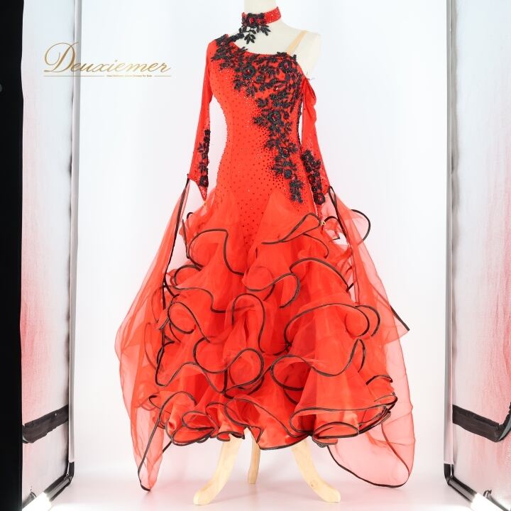 社交ダンス 衣装 スタンダードドレス ワンピース ドレス スタンダード フロート 赤 黒 デモ 競技 VeRTigo フリル レース ブラック系 レッド系 競技用ドレス ダンス衣装 フロートデザイン 華やか パーティー 衣装フリル おしゃれ ステージ衣装 女性用 上品